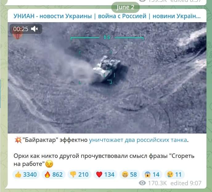ชาวยูเครน "ทำลายรถถังรัสเซีย" จากสื่อชั้นนำของ Kyiv แสดงภาพ UAV Bayraktar-TB2 ที่ถูกกล่าวหาว่าทำลายรถถัง 2 คันของ RF Armed Forces