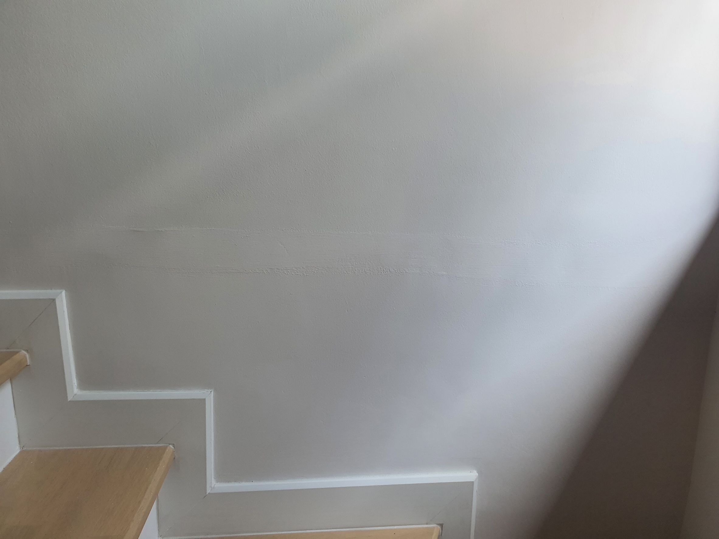 แต่ช่างบอกมีรอยร้าวตรงบันได แล้วเขาเอาดินสอขีดๆเป็นสัญลักษณ์เลยว่าจะเข้ามาโป๊วให้ พอโปะให้เสร็จทาสีอะไรเสร็จ พอเราเช็คงานกลายเป็นว่า เป็นรอยไม่เสมอกันแบบนี้ค่ะ