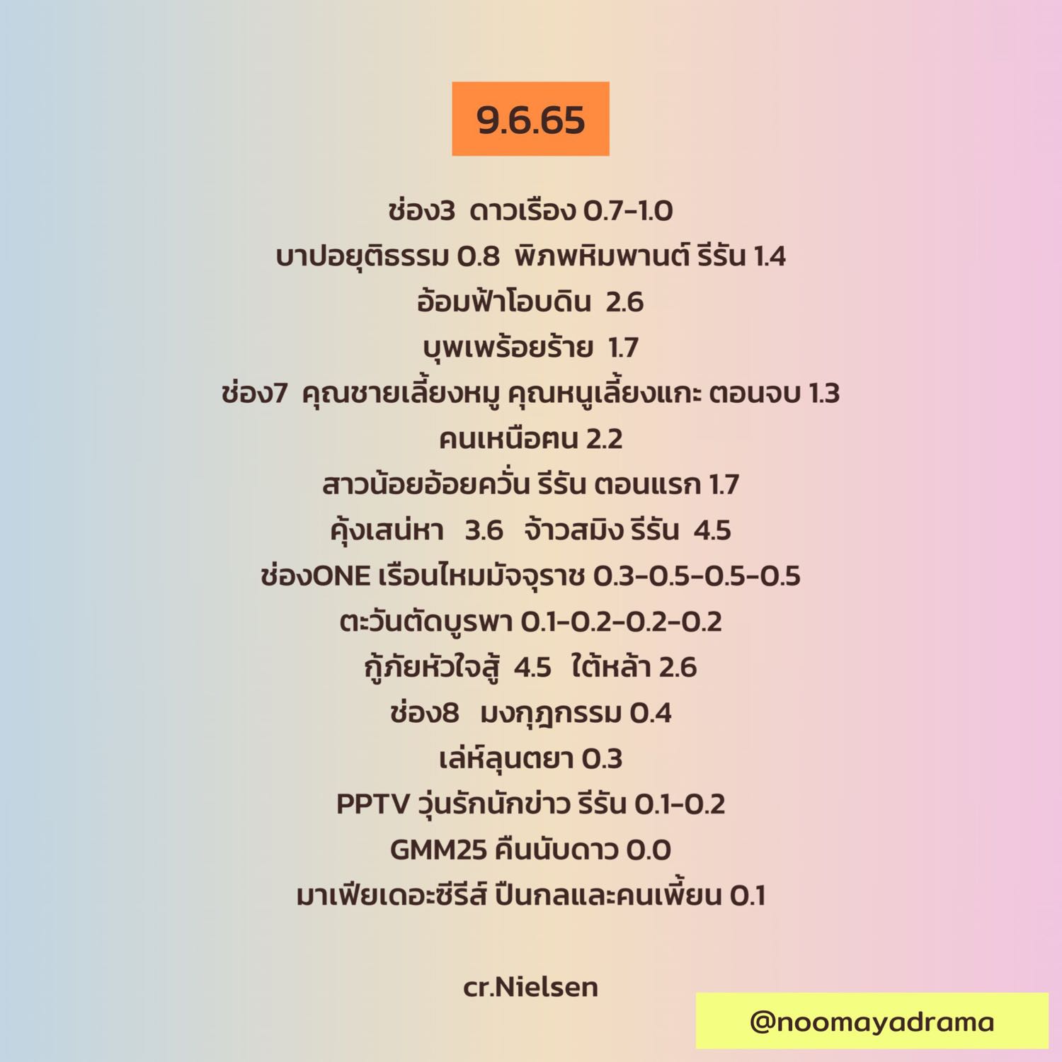 เรตติ้งรวมทั่วประเทศ วันที่ 9 มิ.ย. 65 • จ้าวสมิงทำนิวไฮ, ใต้หล้ายังแรงดี, บุพเพร้อยร้ายสู้ๆ