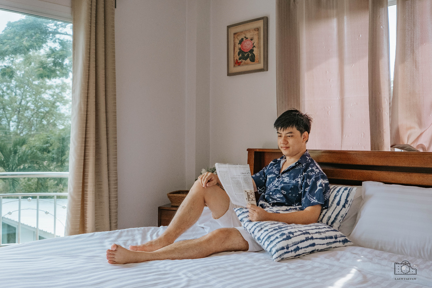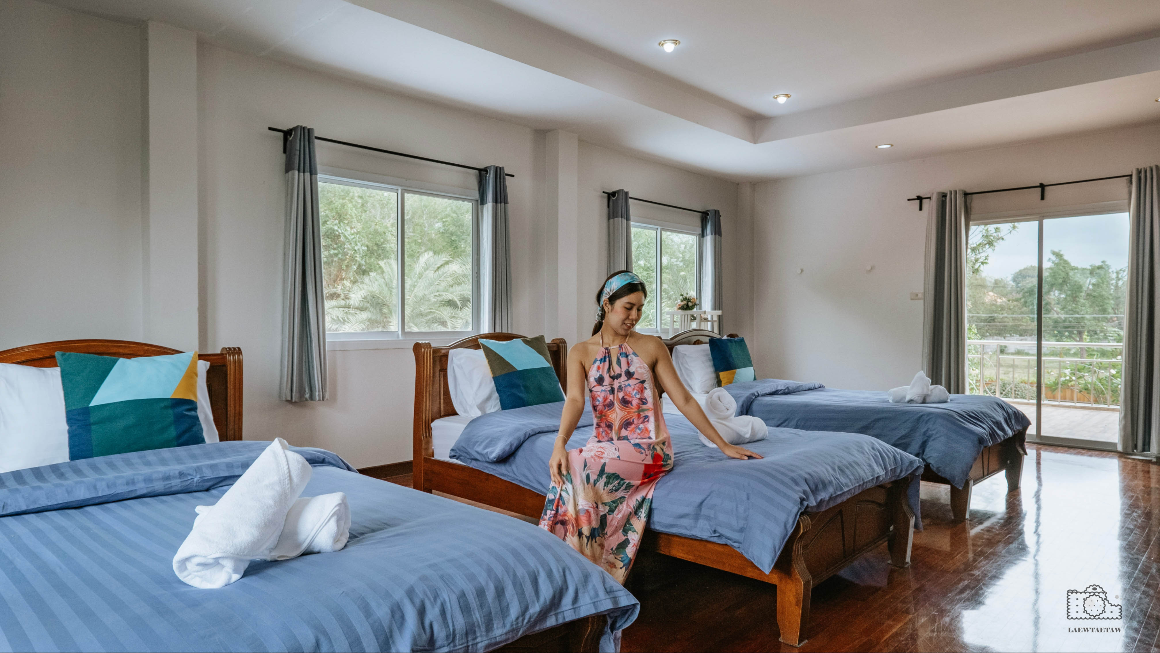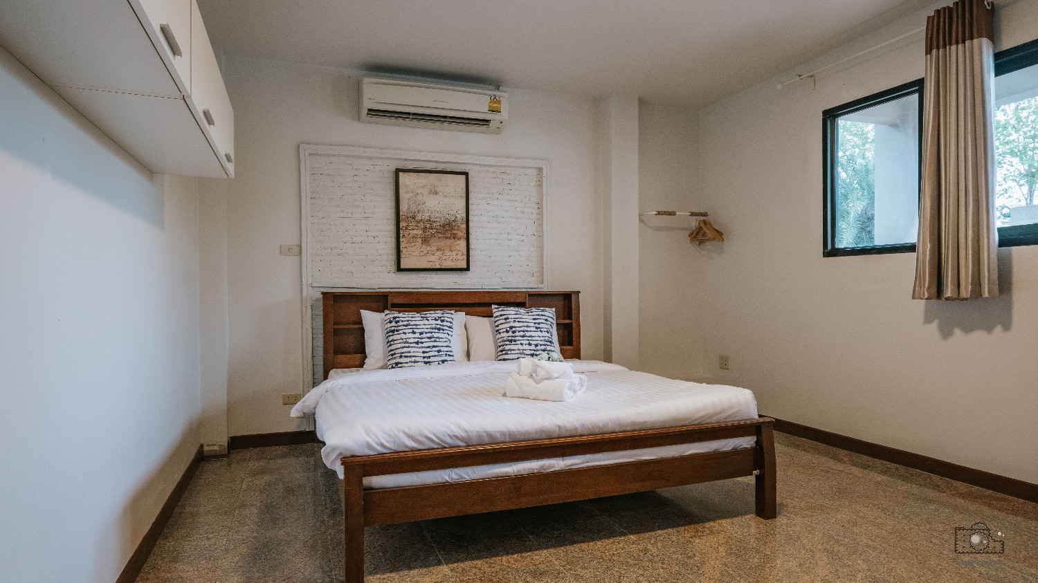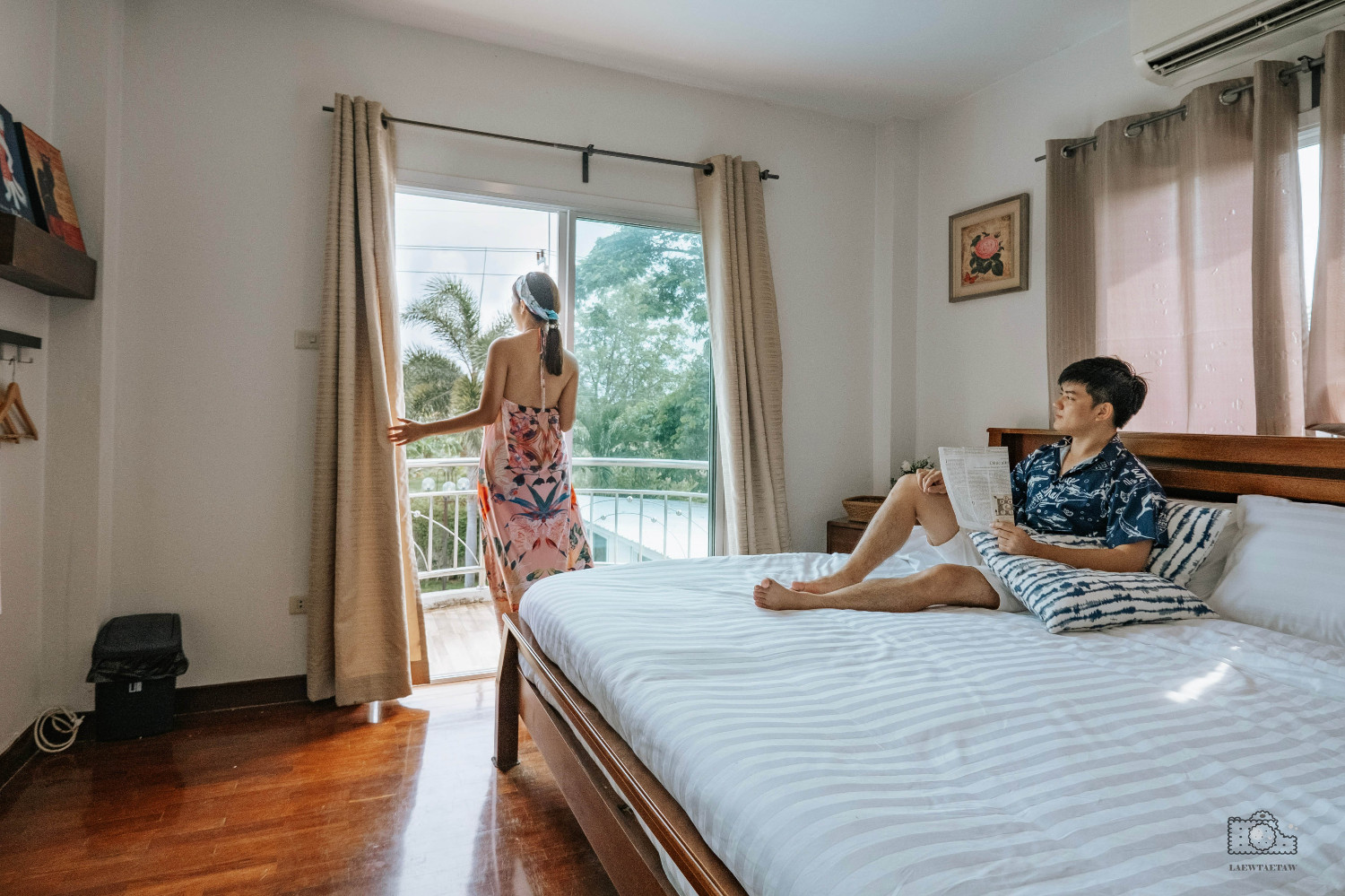 ห้อง A201 เตียงนอนขนาด 6 ฟุต มีระเบียงด้านนอก เดินออกมาชมวิวได้