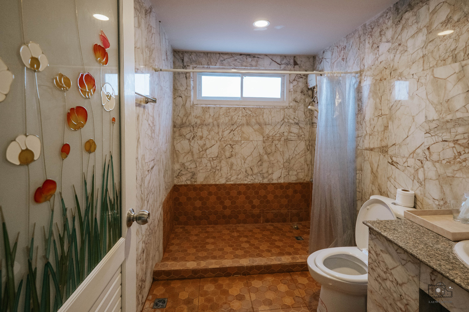 ห้องน้ำส่วนกลาง 1 ห้อง แยกโซนแห้งโซนเปียก ในห้องอาบน้ำทุกห้องมีอุปกรณ์อาบน้ำ เช่น ผ้าขนหนู ,ชุดแปรงสีฟัน ,สบู่,แชมพู,ครีมอาบน้ำ,หวี ไว้ให้บริการ