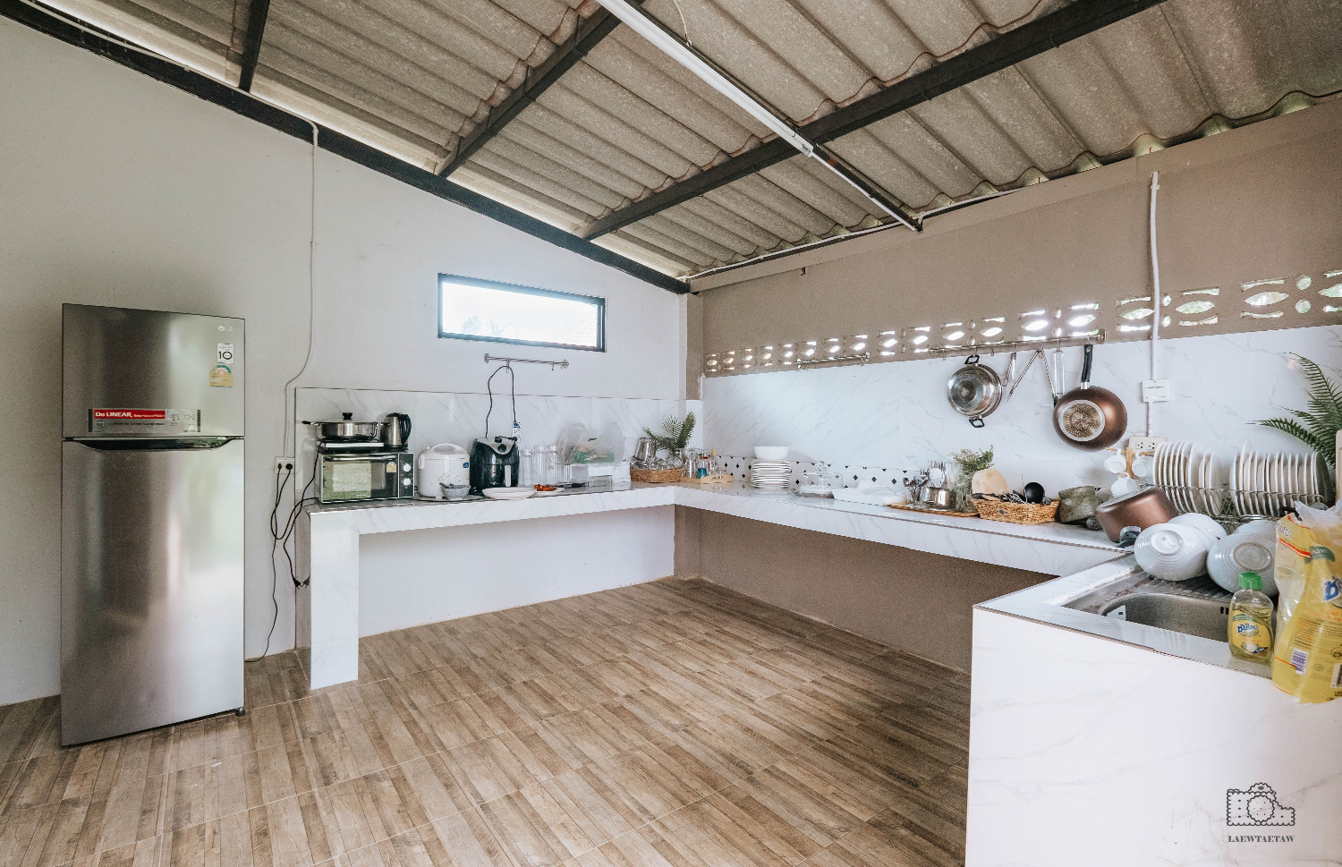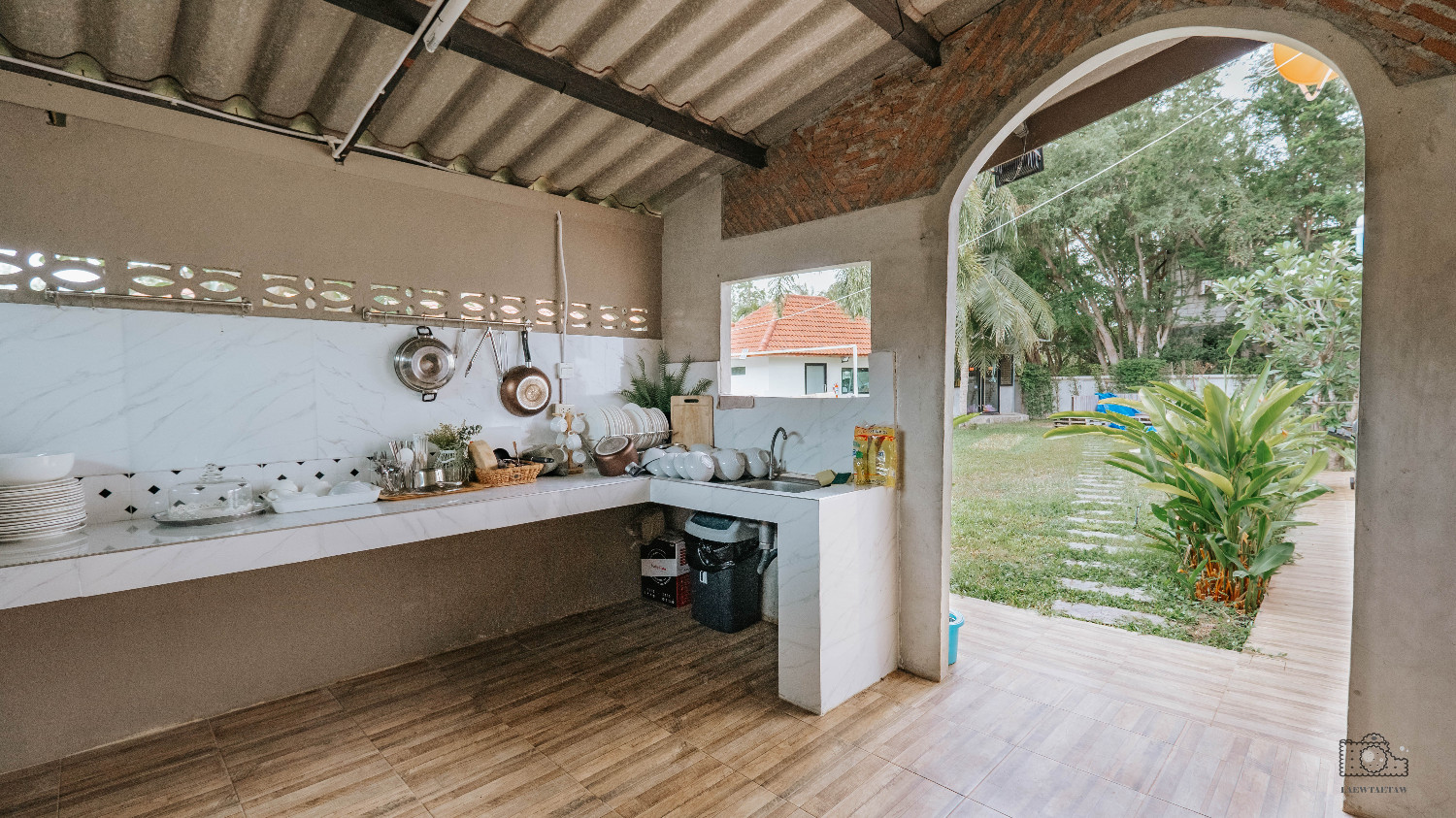 ส่วนของครัวจะเชื่อมต่อกับสวนหลังบ้าน สามาถทำอาหารและไปปาตี้กันในสวนได้ง่าย ๆ เลย