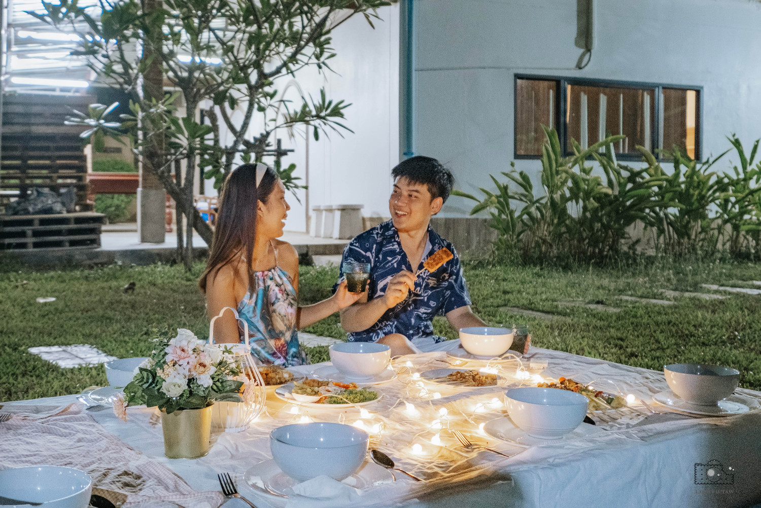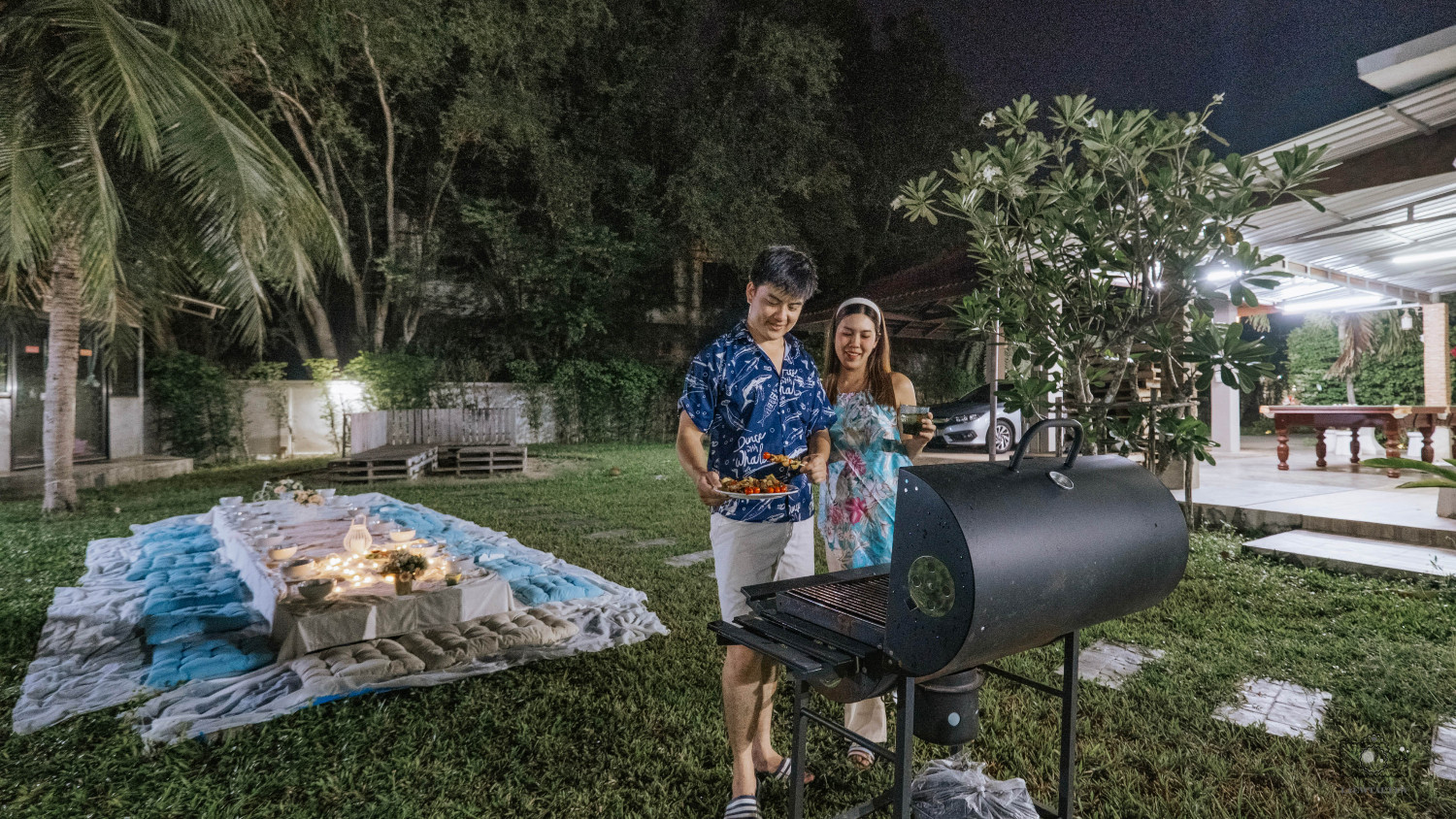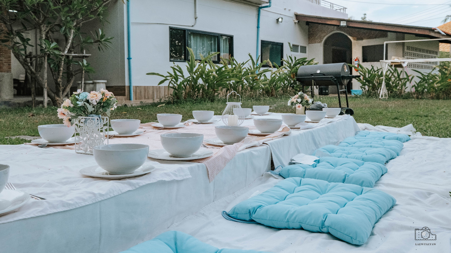 บริเวณสวนทางบ้านดุจนภาก็ได้จัดเตรียมเซทสำหรับปาร์ตี้ไว้ด้วย เป็นที่นั่งดินเนอร์ในสวนพร้อมจาน ชาม ครบ ด้านข้างมีเตาบาร์บีคิวไว้ให้บริการ