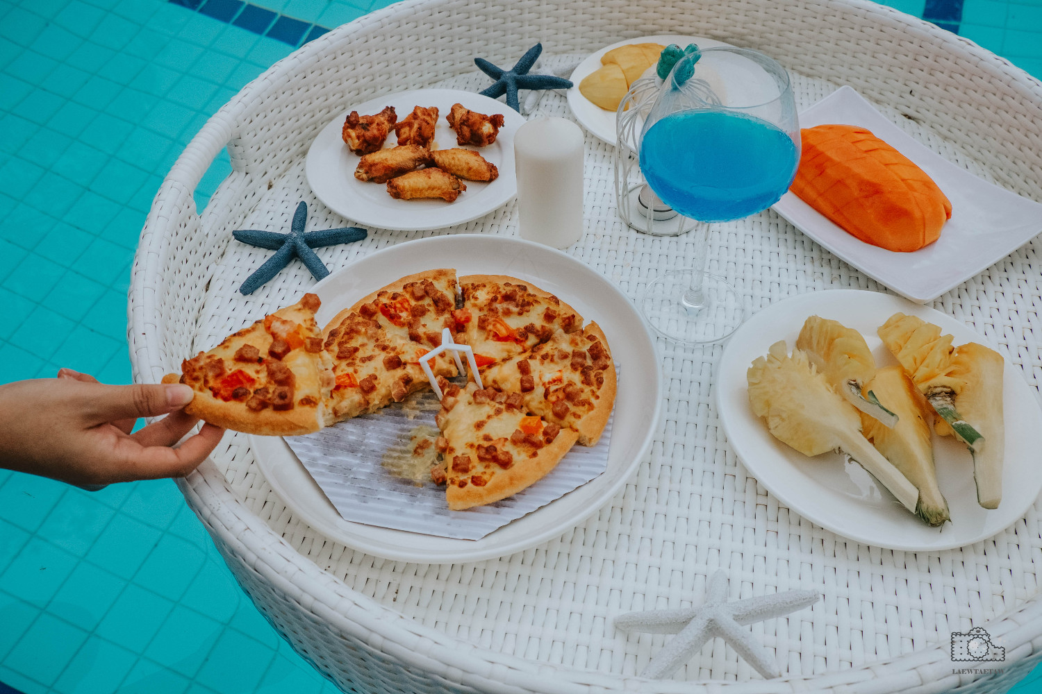สำหรับมื้อเช้า ทางบ้านดุจนภาก็มีจัดเตรียมชุดข้าวต้มกุ้ง และFloating ลอยน้ำไว้ให้มีทั้งพิซซ่า ไก่ทอด ผลไม้ต่าง ๆ