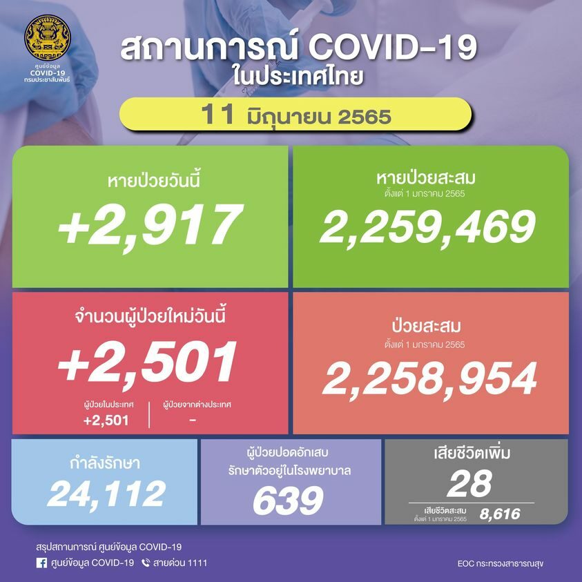 เมื่อวันที่ 11 มิถุนายน ศูนย์ข้อมูลโควิด 19 รายงานผู้ป่วยติดเชื้อโควิด-19 ประจำวันเสาร์ที่ 11 มิถุนายน 2565