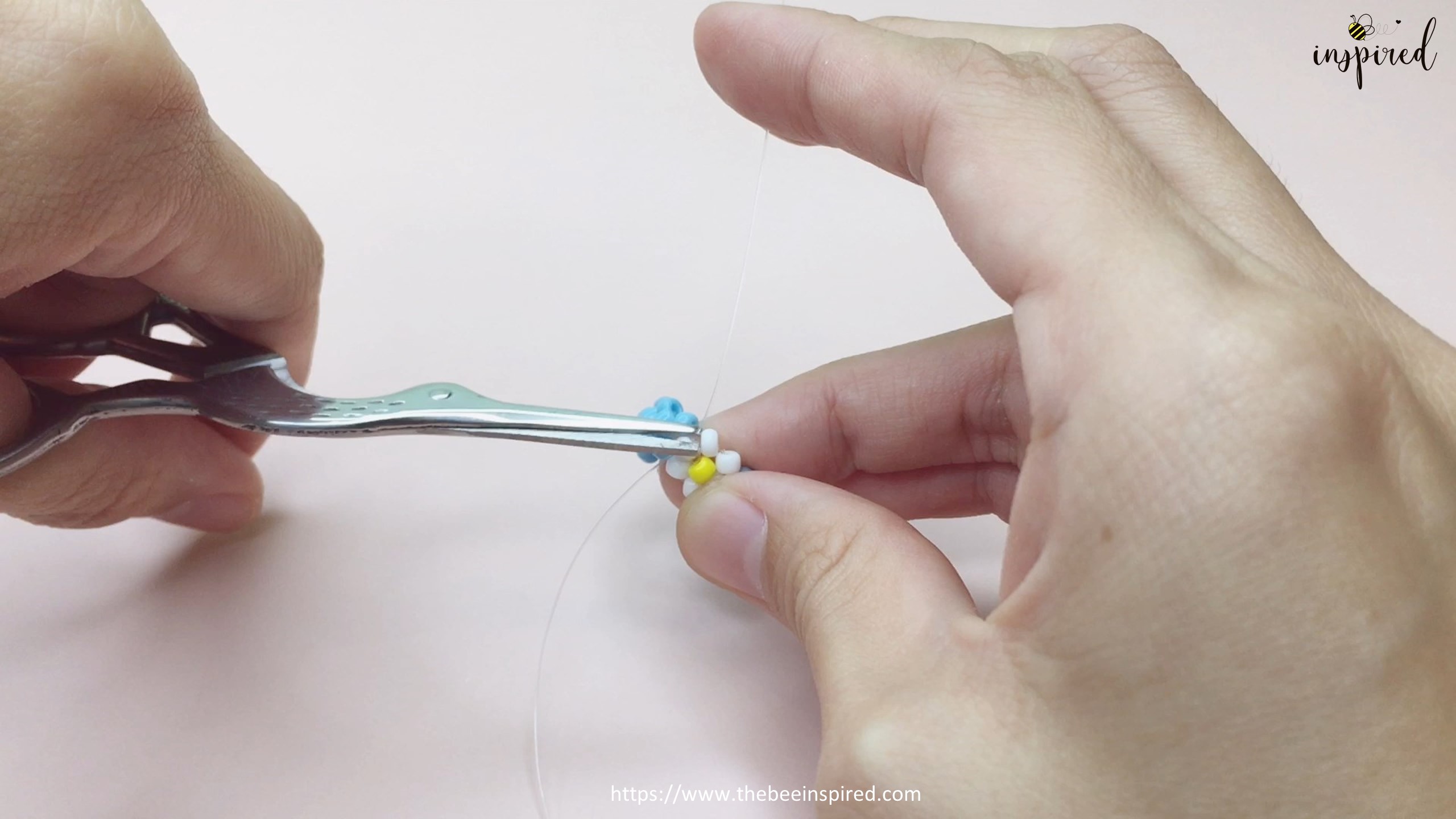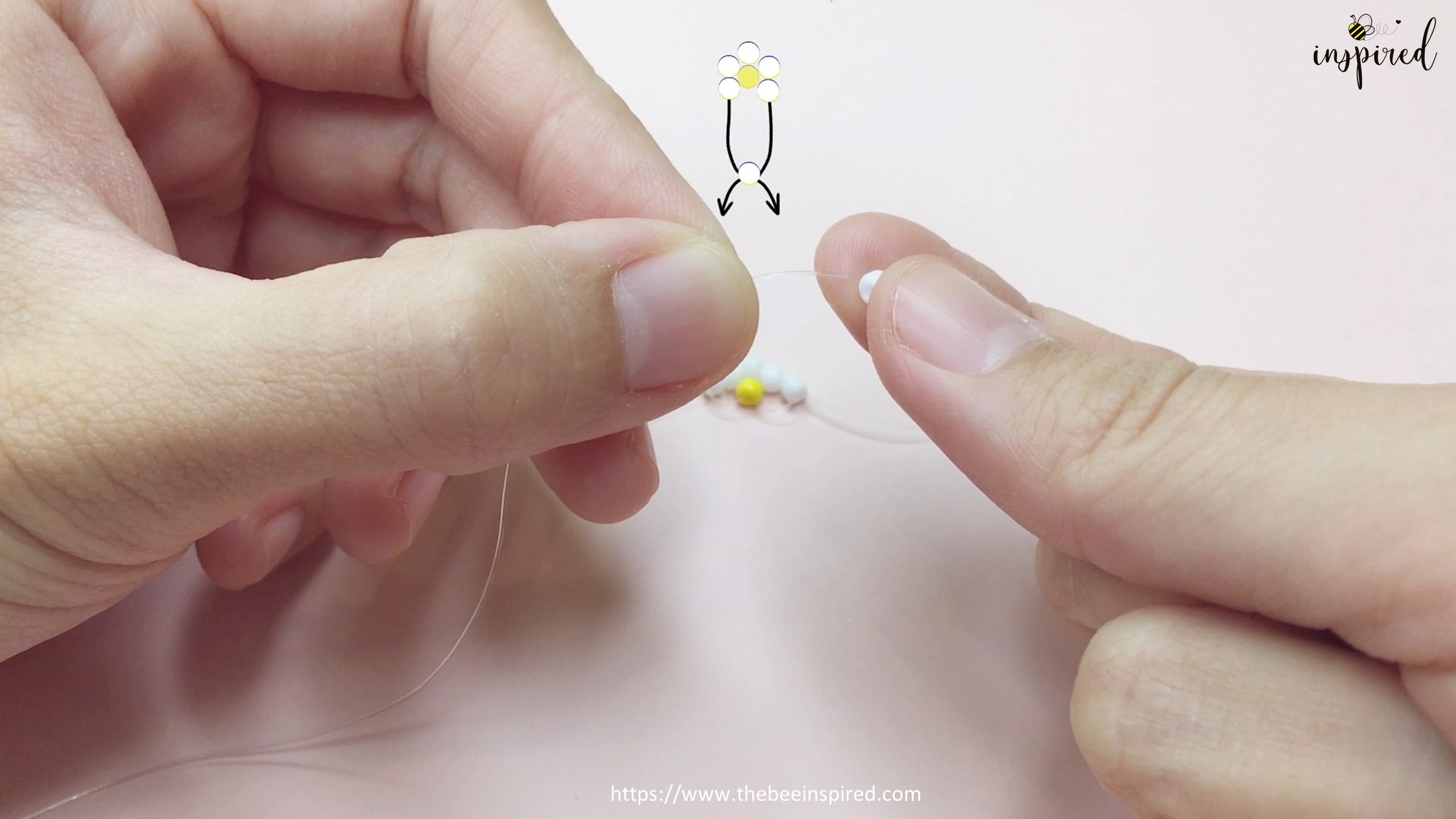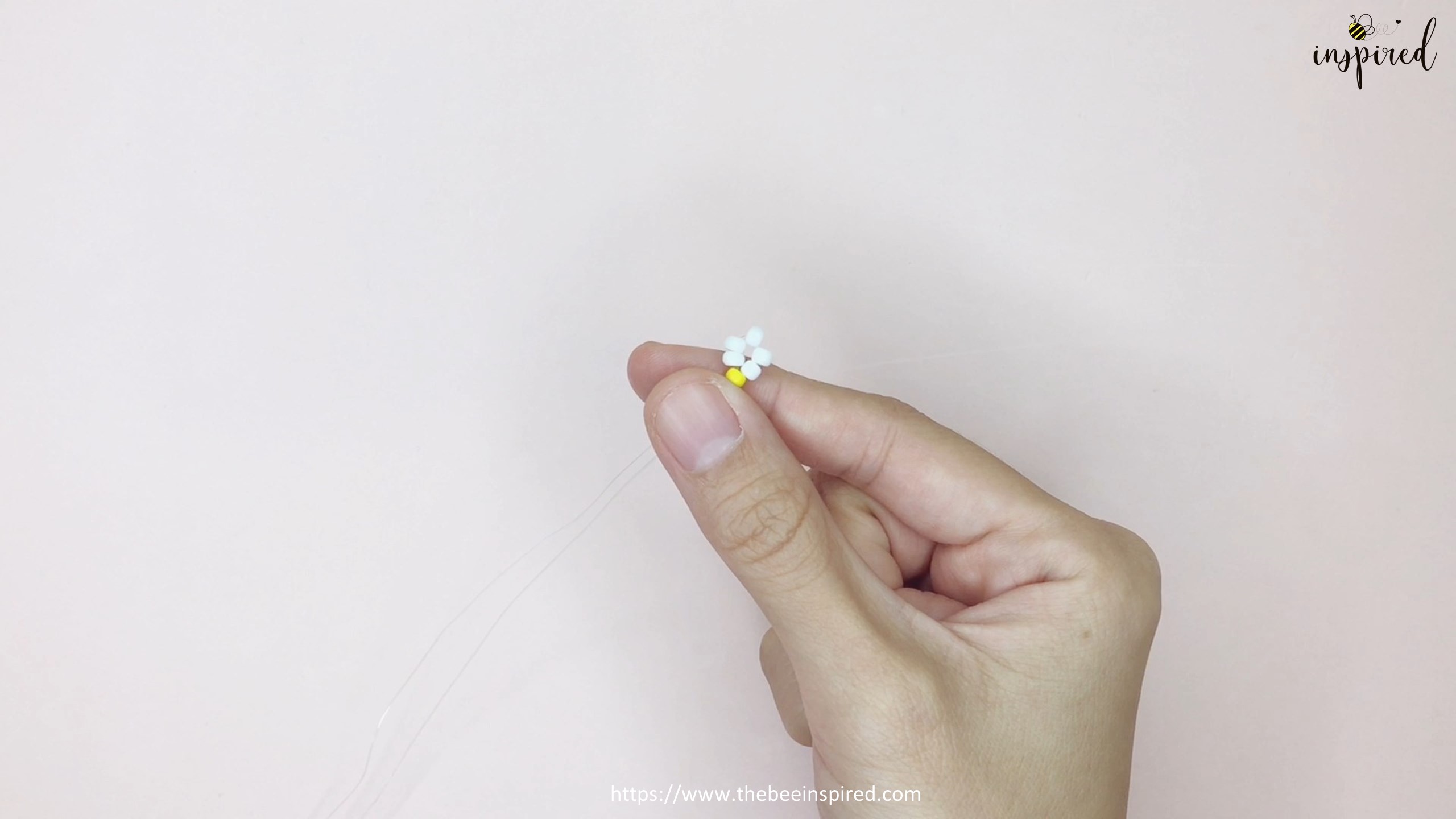 3. ต่อไปก็ร้อยลูกปัดสีขาวเพิ่ม 1 เม็ด และนำปลายเอ็นอีกด้านมาร้อยสวนกัน ก็จะได้น้องเดซี่มาแล้ว