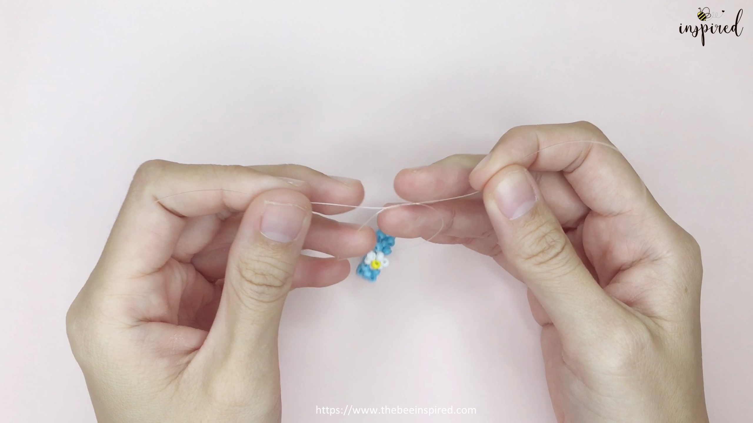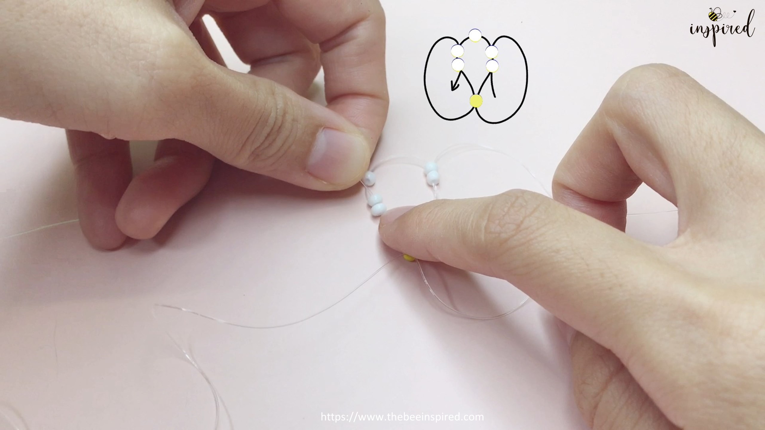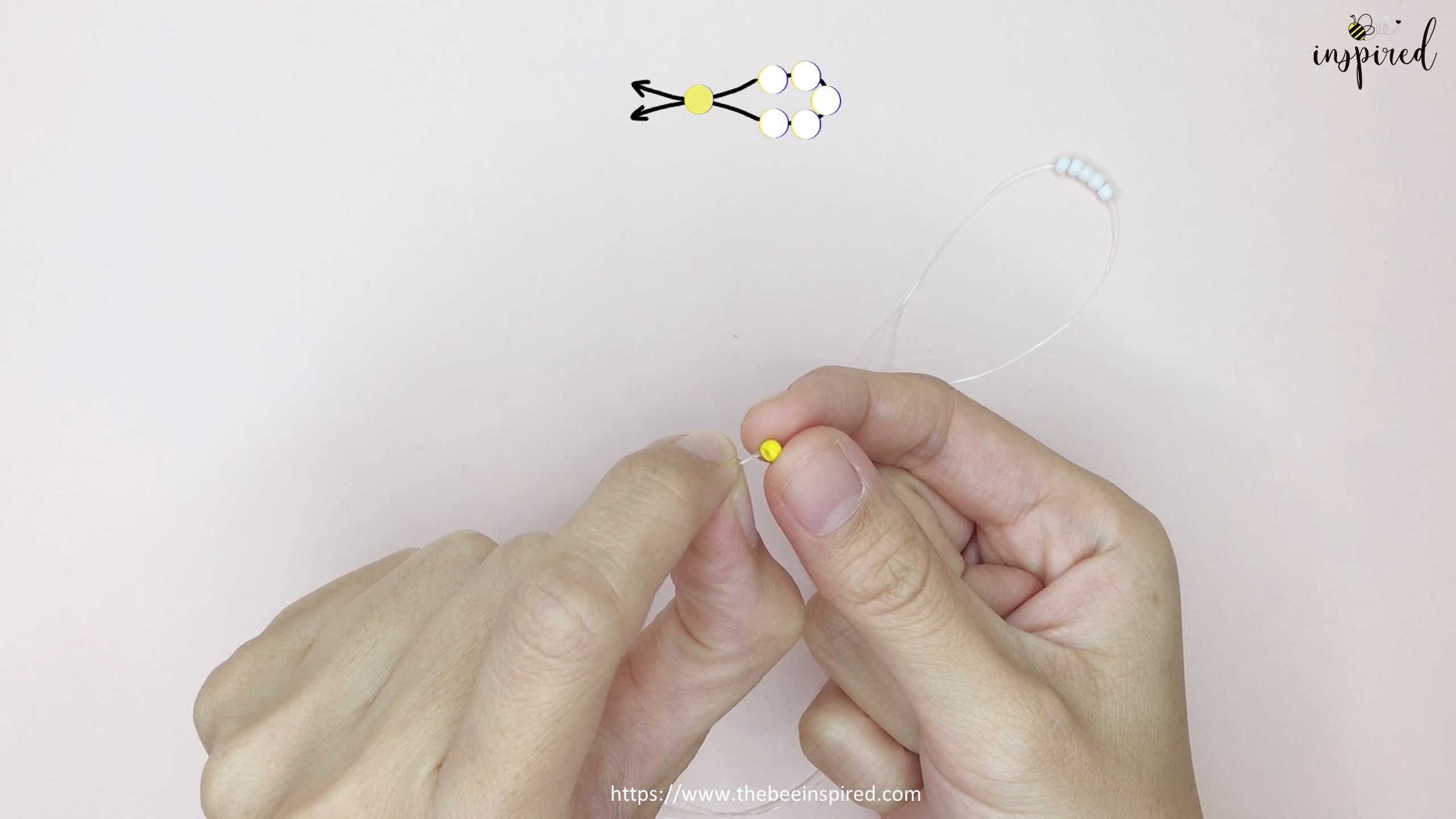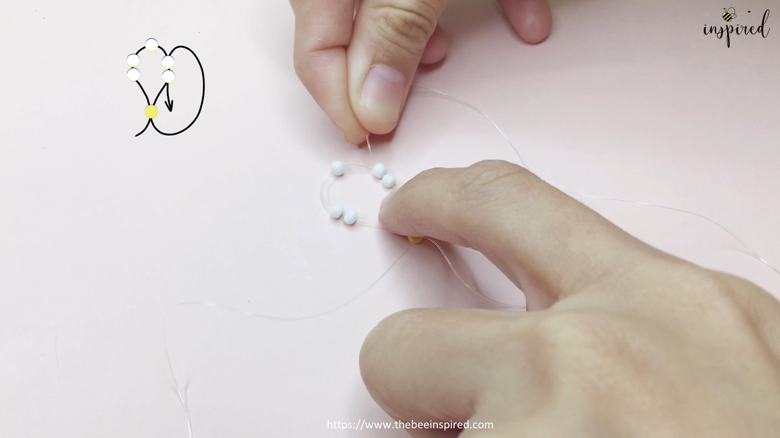 3. ต่อไปก็ร้อยลูกปัดสีขาวเพิ่ม 1 เม็ด และนำปลายเอ็นอีกด้านมาร้อยสวนกัน ก็จะได้น้องเดซี่มาแล้ว