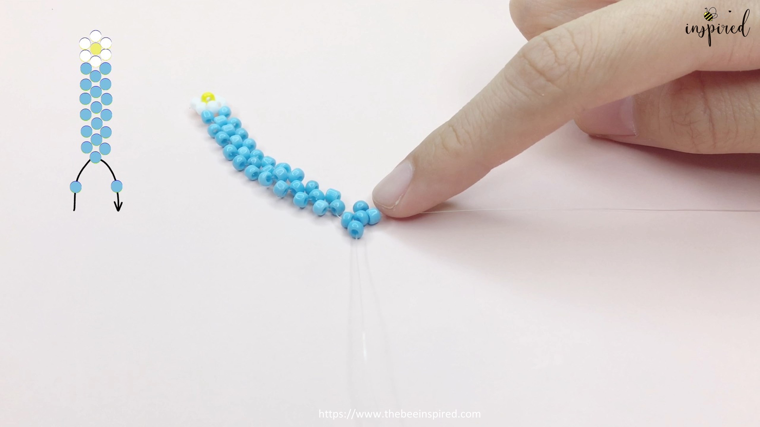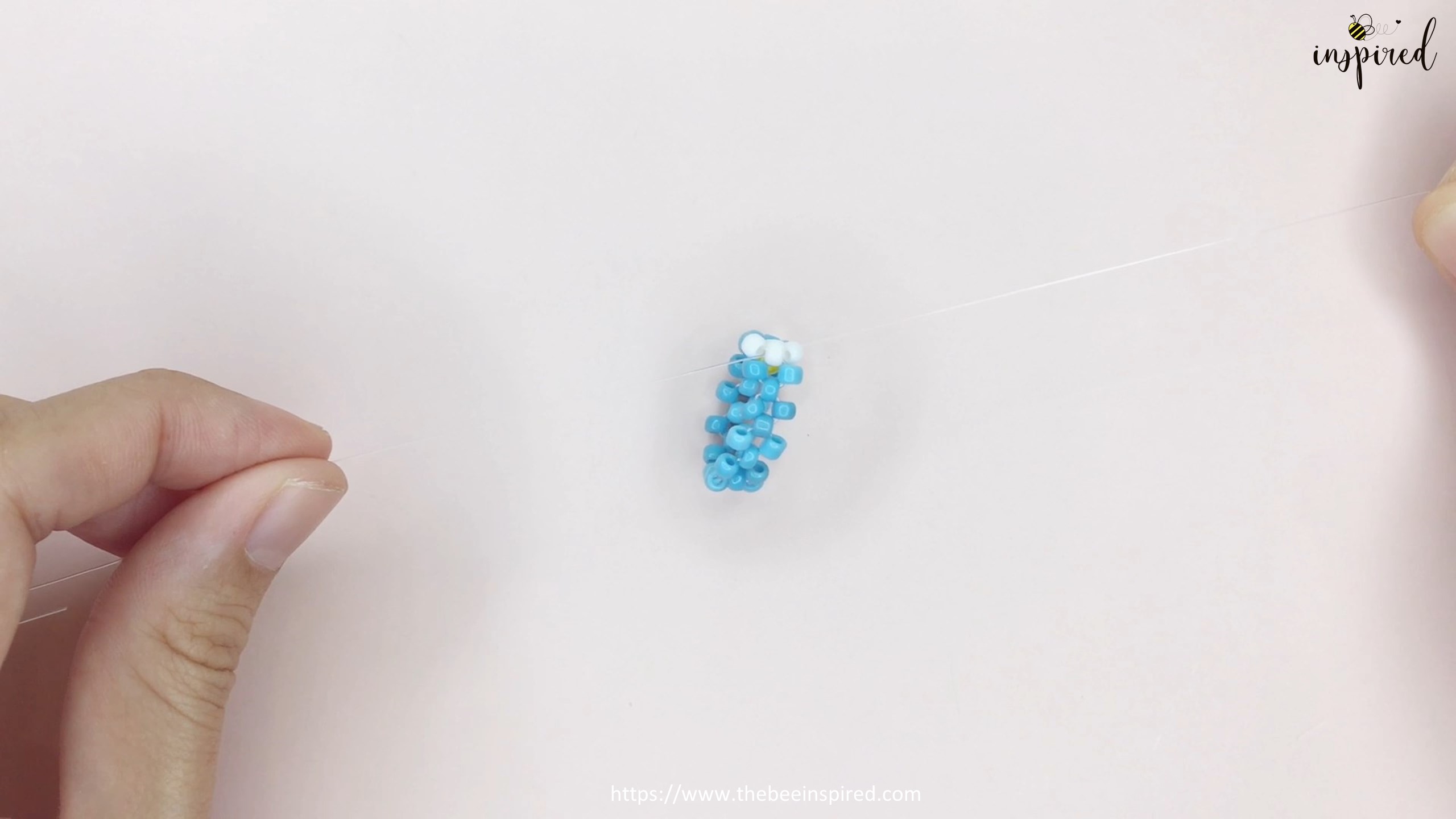5. ต่อไปให้ร้อยลูกปัดสีฟ้าแบบนี้ไปเรื่อยๆ จนได้ความยาวที่ต้องการ จากนั้นก็ร้อยลูกปัดสีฟ้าปิดท้ายเพิ่มไปด้านละ 1 เม็ด