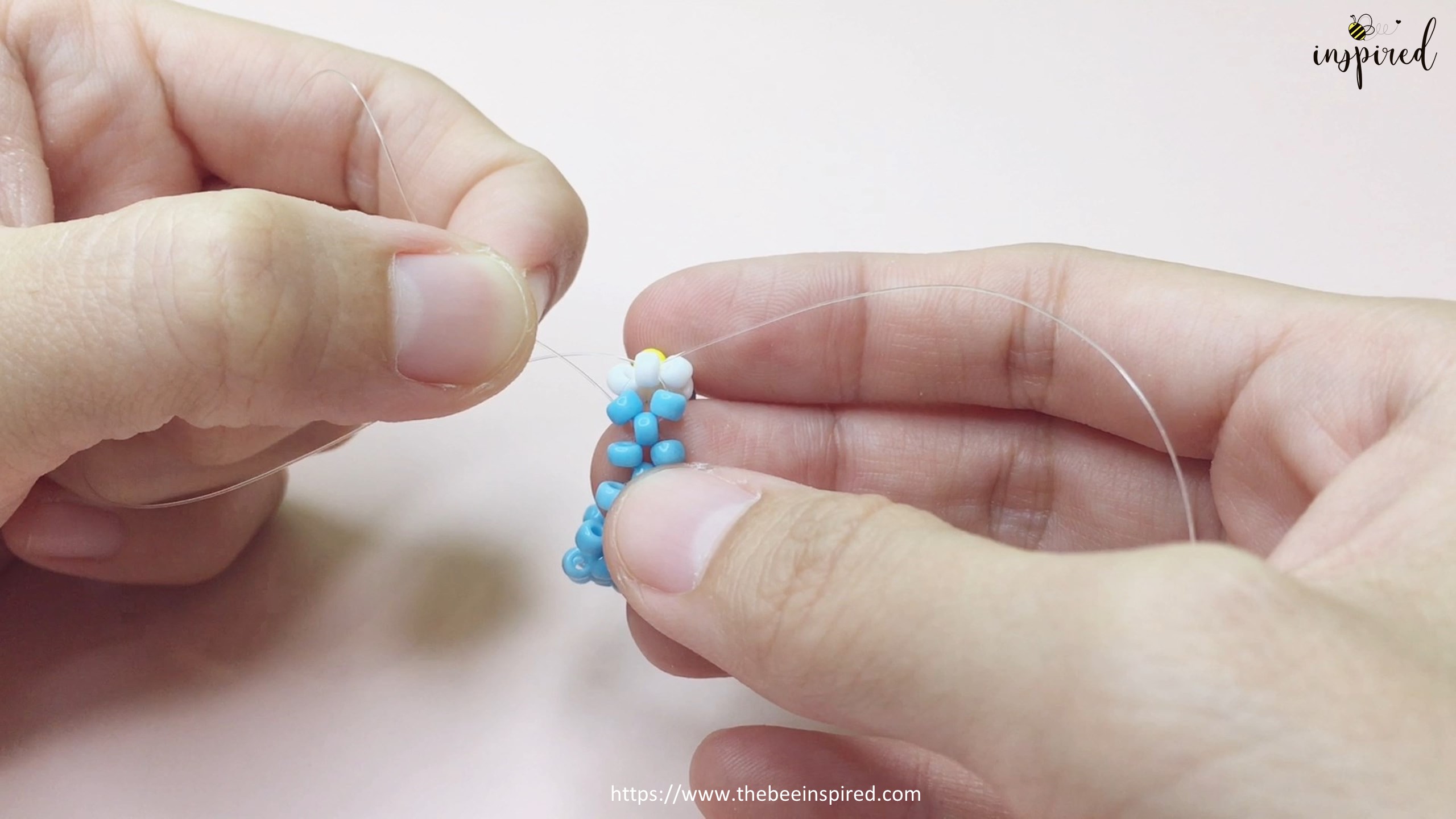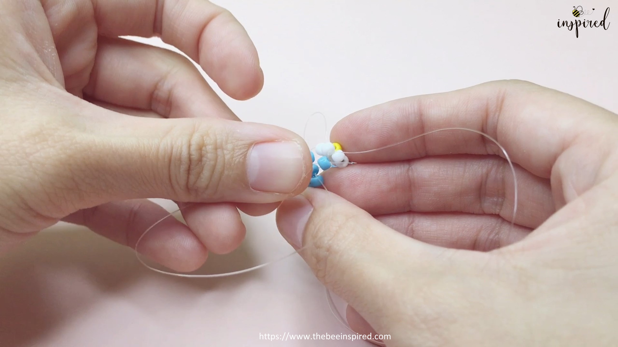 4. จากนั้นก็ร้อยลูกปัดสีฟ้าเพิ่มเข้าไปด้านละ 1 เม็ด และร้อยปลายเอ็นสวนกันที่ลูกปัดสีฟ้าอันใหม่ 1 เม็ด