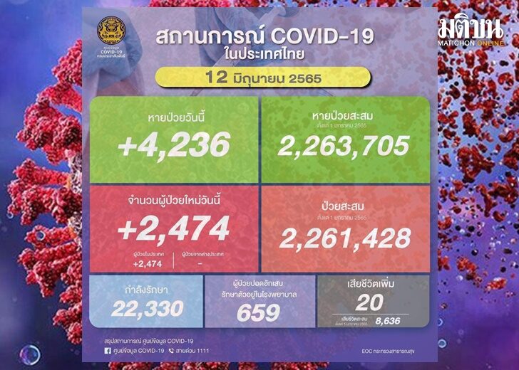 หายป่วยกลับบ้าน 4,236 ราย หายป่วยสะสม 2,263,705 ราย (ตั้งแต่ 1 ม.ค.65) ผู้ป่วยกำลังรักษา 22,330 ราย