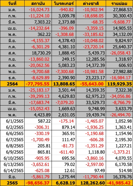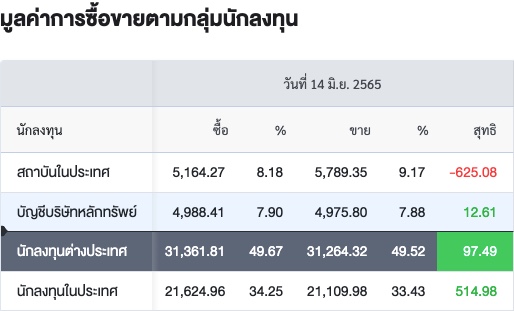 Sinthorn Summary 14/6/2565 : ต่างชาติซื้อสุทธิ 97.49 ลบ.