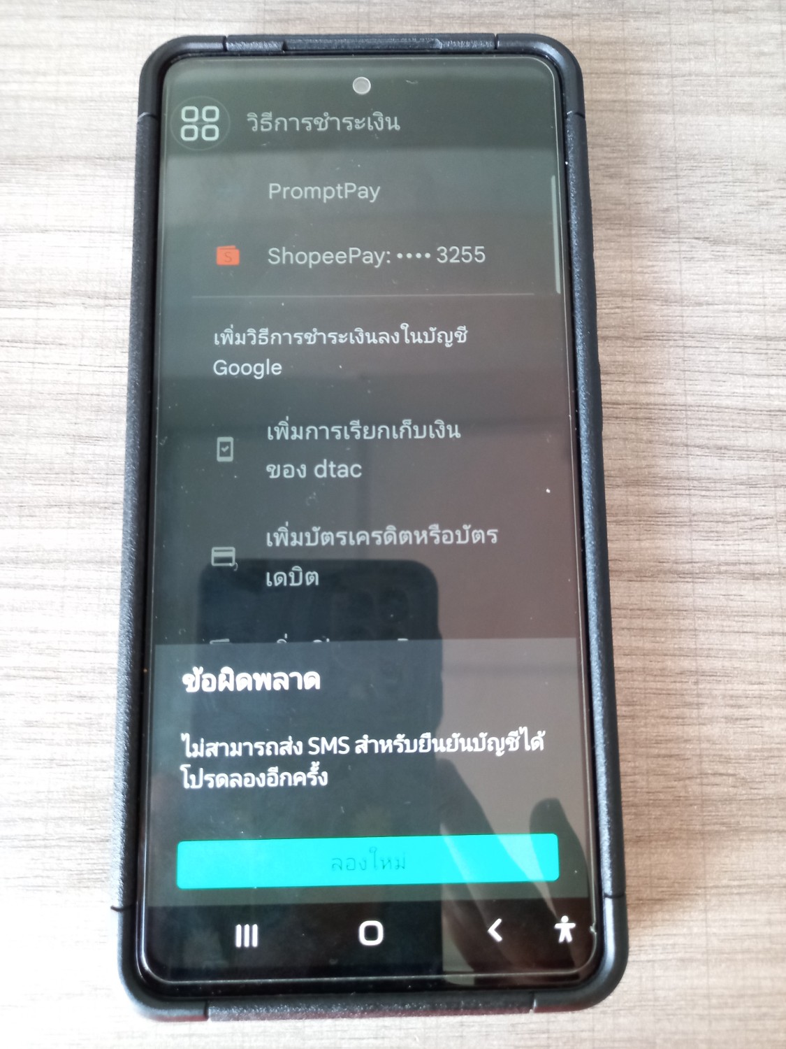 Google Play Store ไม่สามารถจ่ายเงินหรือเพิ่มการเรียกเก็บเงินเป็น dtac ได้ครับ ปรากฎ "ข้อผิดพลาด ไม่สามารถส่ง SMS สำหรับยืนยันบัญชีได้"