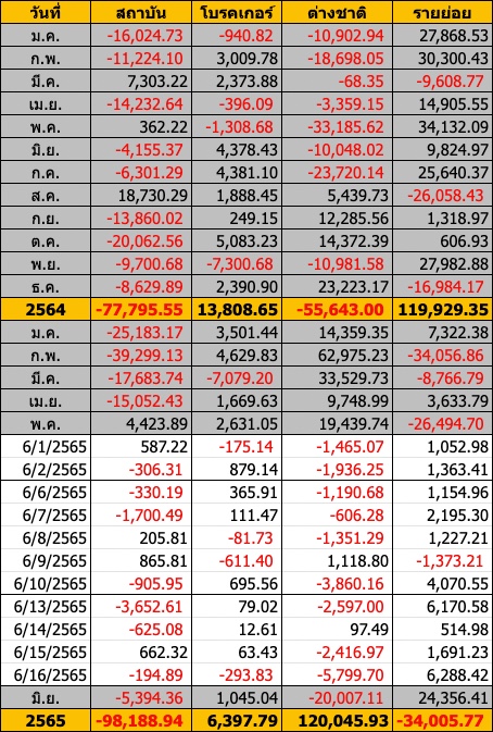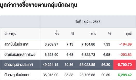 Sinthorn Summary 16/6/2565 : ต่างชาติขายสุทธิ -5,799.70 ลบ.
