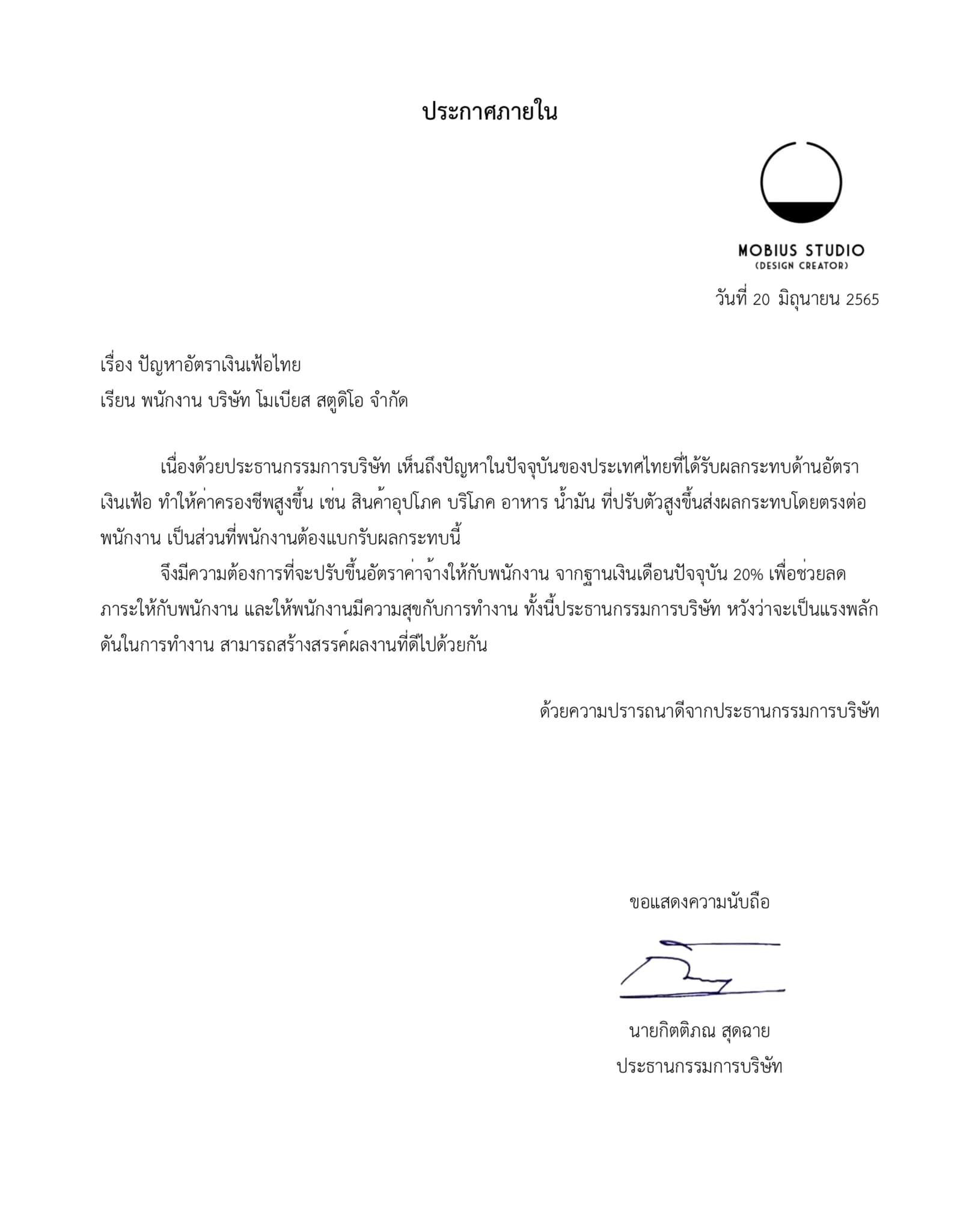 ผู้สื่อข่าวรายงานว่า ในโลกออนไลน์มีการแห่ชื่นชม และแชร์โพสต์ของ บริษัท โมเบียส สตูดิโอ จำกัด บริษัทสตูดิโอตกแต่งภายใน ที่โพสต์ประกาศเรื่อง ปัญหาอัตราเงินเฟ้อไทย ที่ประกาศเพิ่มเงินเดือนพนักงาน 20 เปอร์เซ็นต์ สู้ปัญหาค่าครองชีพที่เพิ่มขึ้นต่อเนื่อง โดยมีเนื้อหาระบุว่า