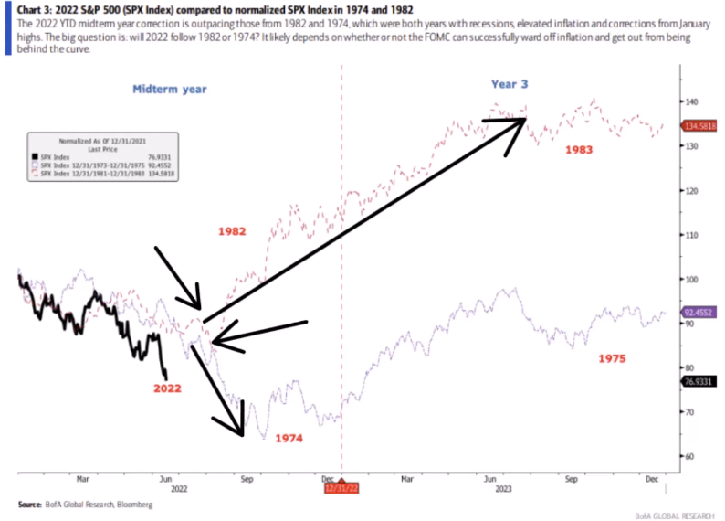 กราฟนี้แสดง S&P500 ในปี midterm election year โดยเปรียบเทียบเฉพาะปีที่มีปัญหา inflation คือ ปีนี้ เทียบกีบปี 1974 และ 1982