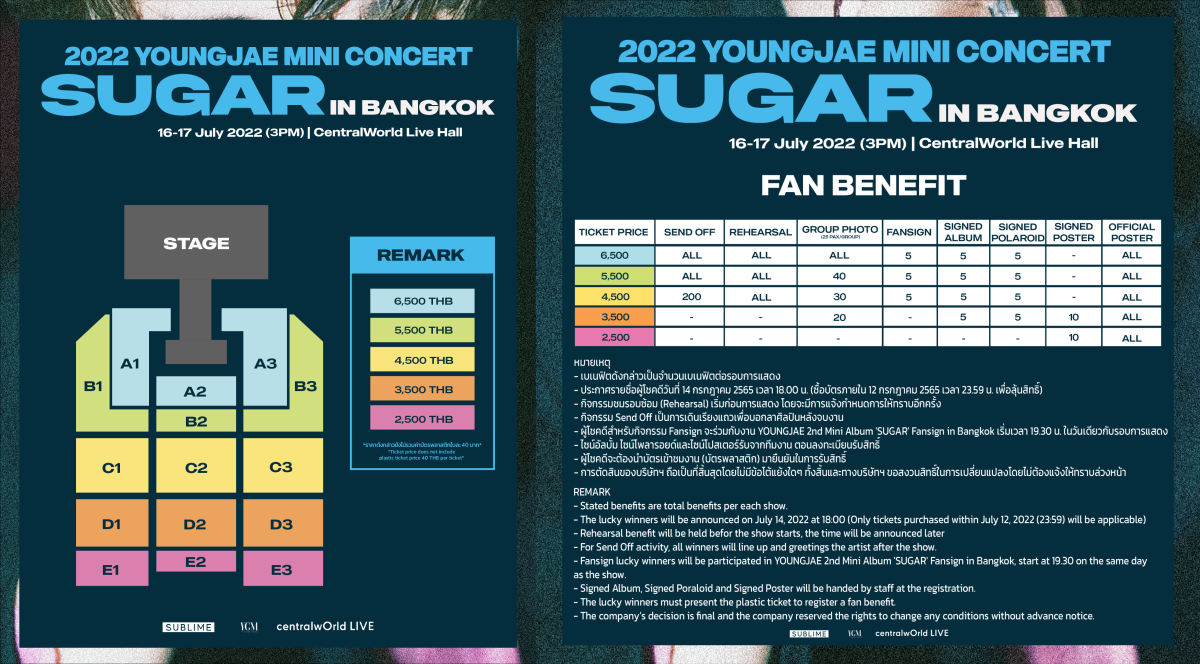หลังจากที่ศิลปินหนุ่มเสียงทรงพลังอย่าง ยองแจ ได้คัมแบ็คโซโล่เดี่ยวด้วยมินิอัลบั้มที่ 2 กับการปล่อยซิงเกิ้ลเพลง "SUGAR" มาให้แฟนๆ ได้ติดตามกัน ล่าสุดก็มีการประกาศมินิคอนเสิร์ตทัวร์ ของหนุ่ม "ยองแจ" ที่ทำเอาเหล่าอากาเซ่ทั้งตื่นเต้น และรอคอยที่จะชมมินิคอนเสิร์ตแบบเต็มรูปแบบครั้งแรกของยองแจในครั้งนี้ และในที่สุด อากาเซ่ชาวไทยแดนเมียหลวงก็ไม่ต้องรอคอยกันแล้วเพราะทุกคนกำลังจะได้ชมความสนุก พร้อมเพลิดเพลินไปกับเสียงเพลง และเสียงร้องของยองแจ รวมทั้งยังได้ใกล้ชิดกับหนุ่มยองแจกันอีกด้วย กับงาน 2022 YOUNGJAE Mini Concert ‘Sugar’ in Bangkok ที่จะจัดขึ้นในวันเสาร์ที่ 16 และอาทิตย์ที่ 17 กรกฎาคม 2565 เวลา 15.00 น. ณ Central World Live Hall บัตรราคา 6500/5500/4500/3500/2500 ขายบัตรผ่านทาง www.yglobal-music.com เริ่มเปิดขายบัตรในวันศุกร์ที่ 1 กรกฎาคม 2565 ตั้งแต่เวลา 18.00 น. เป็นต้นไป