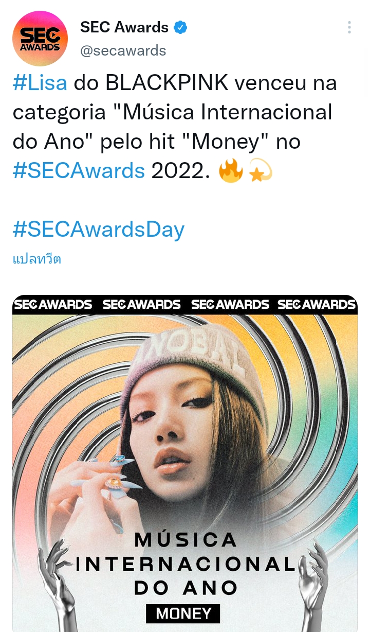 ขอแสดงความยินดี กับ 🏆LISA-MONEY🏆 ได้รับรางวัล International song จาก SEC Awards 2022 🎉🎶🎉