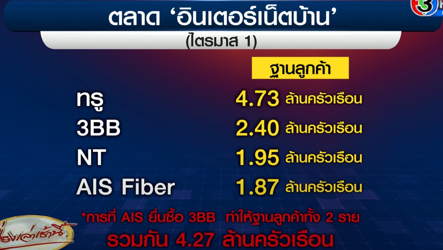 AIS + 3BB รวมกัน ได้แค่ 4.27 ล้านครัวเรือน ยังห่างจากทรู 460,000 ครัวเรือน