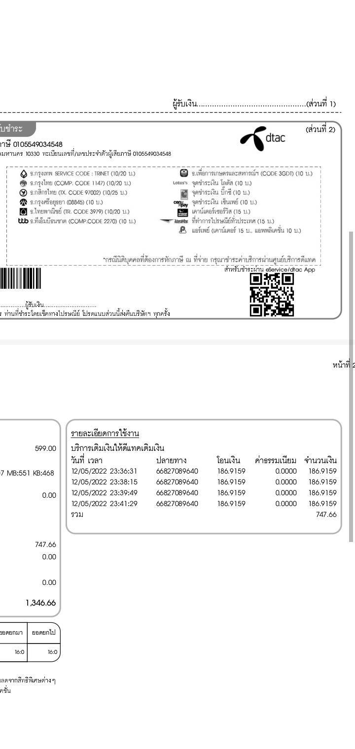 เรื่องมีอยู่ว่า ได้ให้แม่เปลี่ยนจากระบบเติมเงินมาเป็นรายเดือน ตลอดระยะเวลาที่ใช้งานที่ผ่านมาคือจ่ายทุกเดือนไม่เคยให้เลยเดือนของรอบบิลนั้นๆ แล้วพอมาถึงเดือนนี้ตอนที่จะกดจ่ายบิลให้แม่ ยอดมันพุ่งจากที่เคยจ่าย เกินไป 800 บาท จึงได้ทำการโทรสอบถามไปยังสำนักงานใหญ่ ได้คำตอบมาว่า เบอร์ของแม่ ได้มีการกดเติมเงินให้กับเบอร์ดีแทคระบบเติมเงิน ในวันที่ 12/05/2022 เวลาที่เติมเงินตามรูปที่แนบเลยค่ะ เป็นจำนวน 4 ครั้ง ซึ่งเมื่อเดือนที่ผ่านมาเราก็จ่ายเงินตามปกติ มันก็ขึ้นเป็นยอดตามที่เคยจ่ายตลอดมา จึงอยากทราบว่า เวลาที่หักเงิน จำเป็นต้องยืนยัน OTP หรือไม่ และที่แน่นอน แม่เติมเงินให้กับเบอร์ดีแทคระบบเติมเงินไม่ได้แน่ เพราะแม่ทำไม่เป็น และช่วงเวลาดังกล่าวที่มีการเติมเงินไปนั้น เป็นช่วงเวลาที่แม่นั้นได้หลับไปแล้ว เป็นไปได้ไหมว่าเบอร์จะโดนมิจฉาชีพแฮกแล้วทำธุรกรรม ซึ่งเราได้ลองโทรไปที่เบอร์ดังกล่าวแล้วโทรไม่ติด เป็นเหมือนเติมเงินเข้าเกมส์ แล้วแบบนี้เราต้องรับผิดชอบในการจ่ายยอดที่ถูกเติมไปไหมคะ