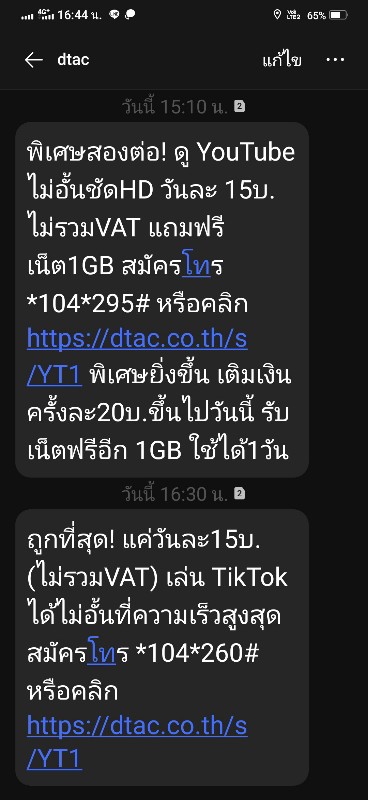 ใช้ซิมเน็ตไม่อั้น ยังจะมี sms จาก dtac ชวนเติมเงินดู tiktok youtube บ่อยมาก จนรำคาญ