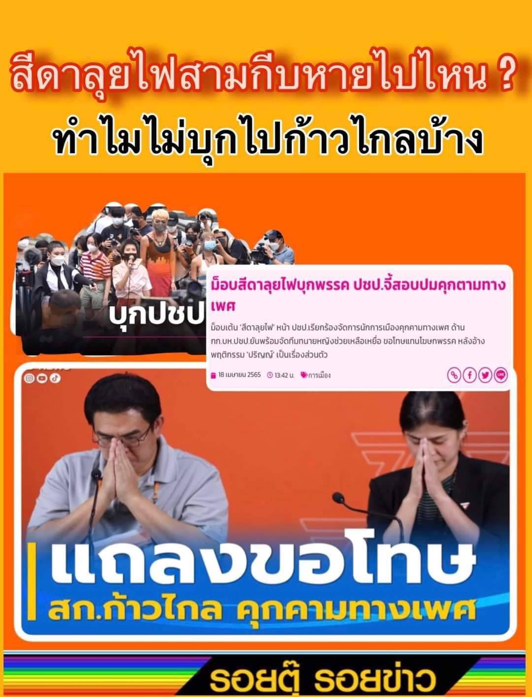 ว่าแต่ตรวจสอบไปถึงไหนแล้ว? ตรวจสอบกันเองยังไงให้ช้า? ล่าสุด‘เพจก้าวไกลโกหกอะไร’ แต่งสีดาลุยไฟ เรียกร้อง ‘ก.ก.’ ตรวจสอบ ส.ส.คุกคามทางเพศ