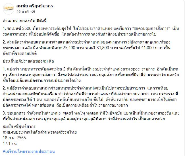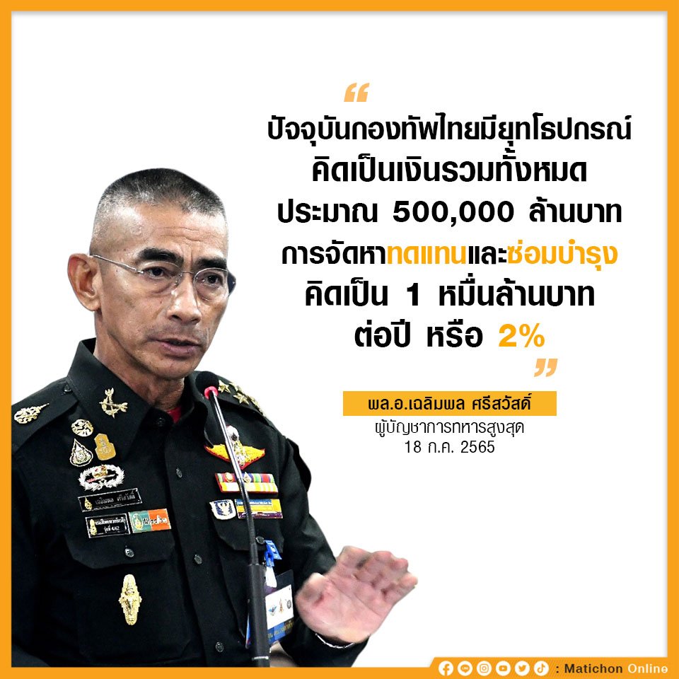 “ปัจจุบันกองทัพไทยมียุทโธปกรณ์คิดเป็นเงินรวมทั้งหมดประมาณ 500,000 ล้านบาท การจัดหาทดแทนในส่วนที่จำเป็น และซ่อมบำรุงคิดเป็น 1 หมื่นล้านบาทต่อปี หรือ 2% เพื่อดูแลรักษาให้คงสภาพ รวมถึงงบประมาณด้านการฝึกกำลังพล การสับเปลี่ยนกำลังทดแทน