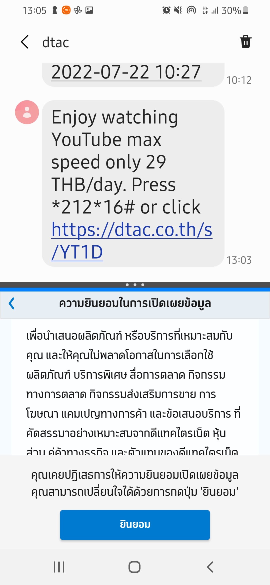 1. ผมกดไม่ให้ความยินยอมในการส่งข้อมูลและใช้ข้อมูลของผมเพื่อทำการตลาดแล้ว ดังจะเห็นได้จากรูปที่ 1 หน้าต่างล่าง ทำไมถึงยังได้ SMS แบบนี้เป็นประจำ