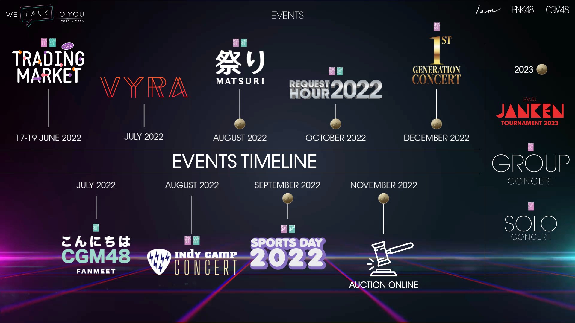 เบงเค - งานที่จัดกับกรุงเทพมหานคร จะเปิดเผยเร็วๆนี้ ถูกใจชาวกทม.มากนัก ไม่รวม RS. มีเดือนละสองครั้ง วงเหนือ - งานหนังสือเชียงใหม่ งาน 7.7 งานลอยกระทง (จัดประกวด) ปลายปีงานเปิดเธียเตอร์ และเลือกตั้งปีน