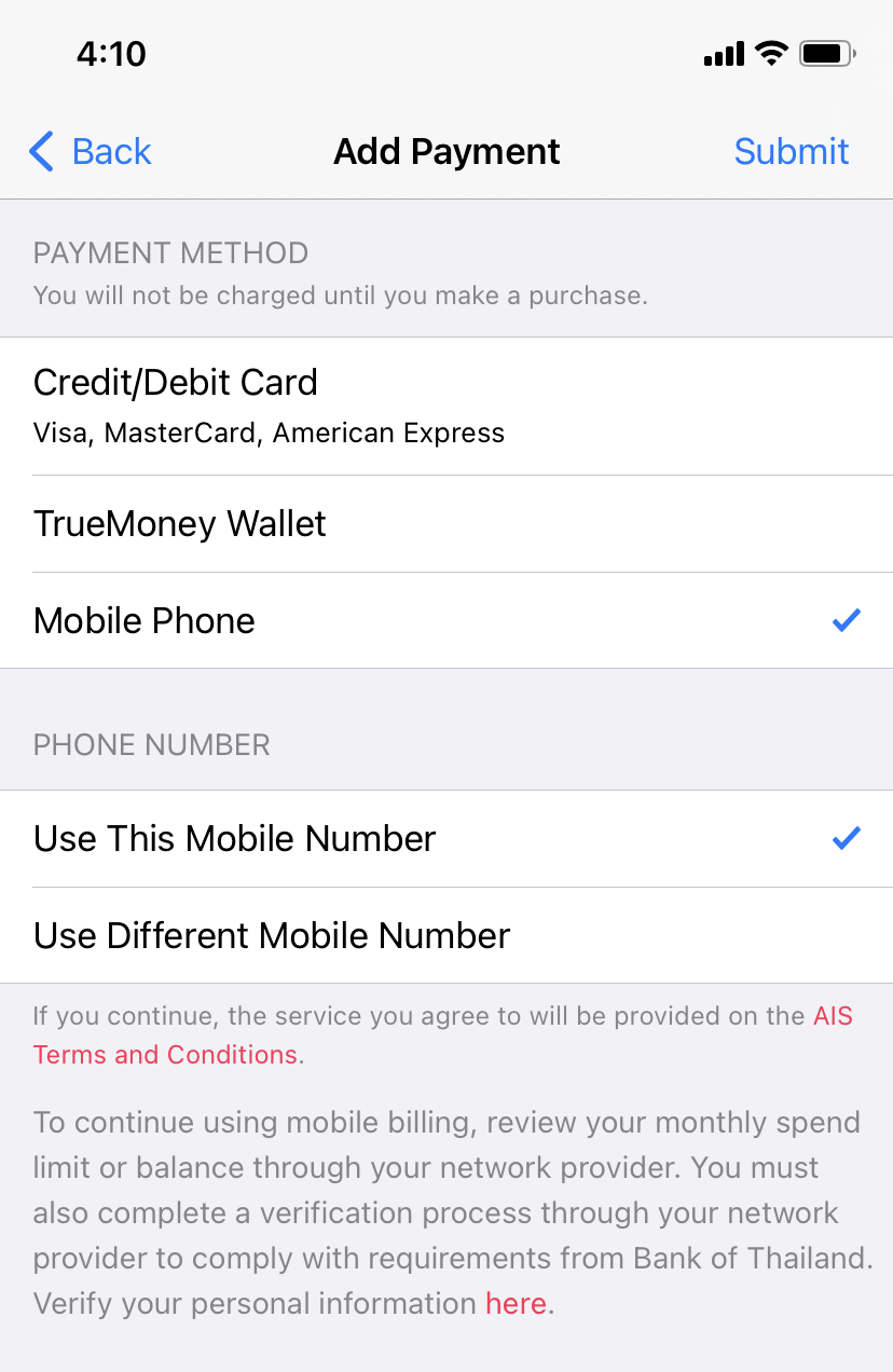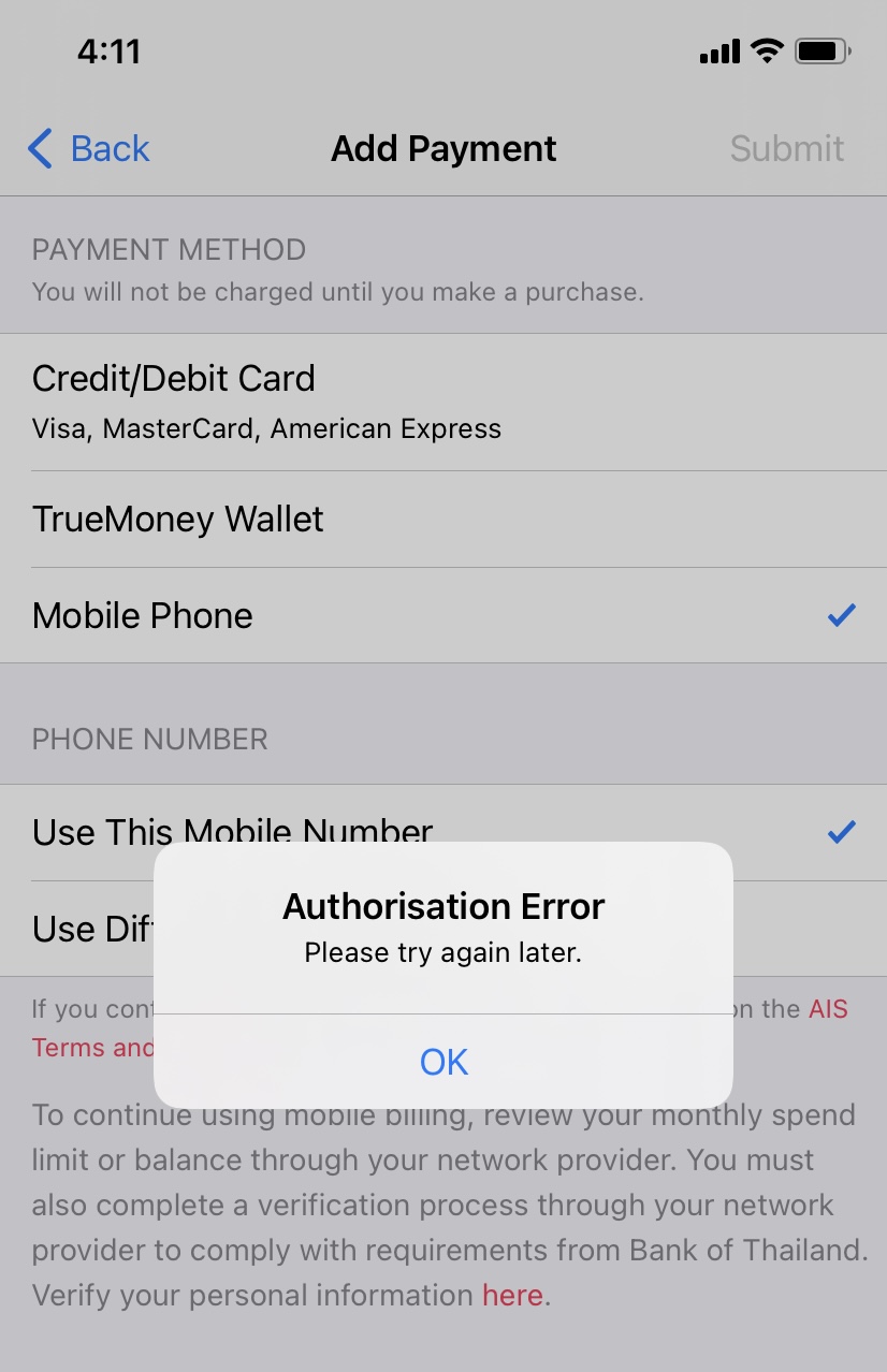 ตั้งค่าหักเงินจากซิม ais ของ apple id ไม่ได้
