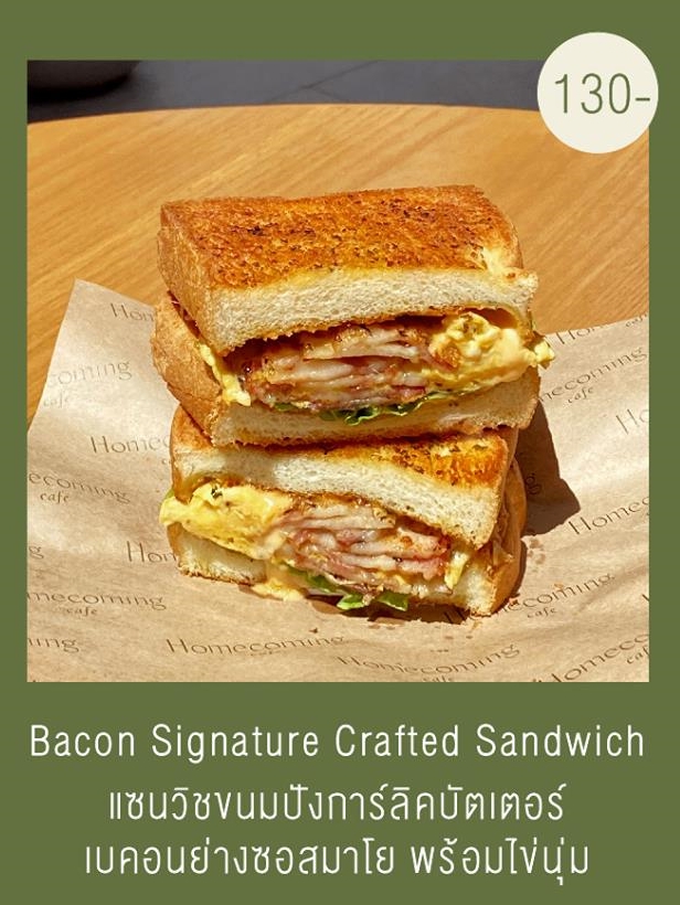 🍽️เมนูที่ 3 : แซนวิชขนมปังการ์ลิคบัตเตอร์ เบคอนย่างซอสมาโย พร้อมไข่นุ่ม - Bacon Signature Crafted Sandwich🍽️