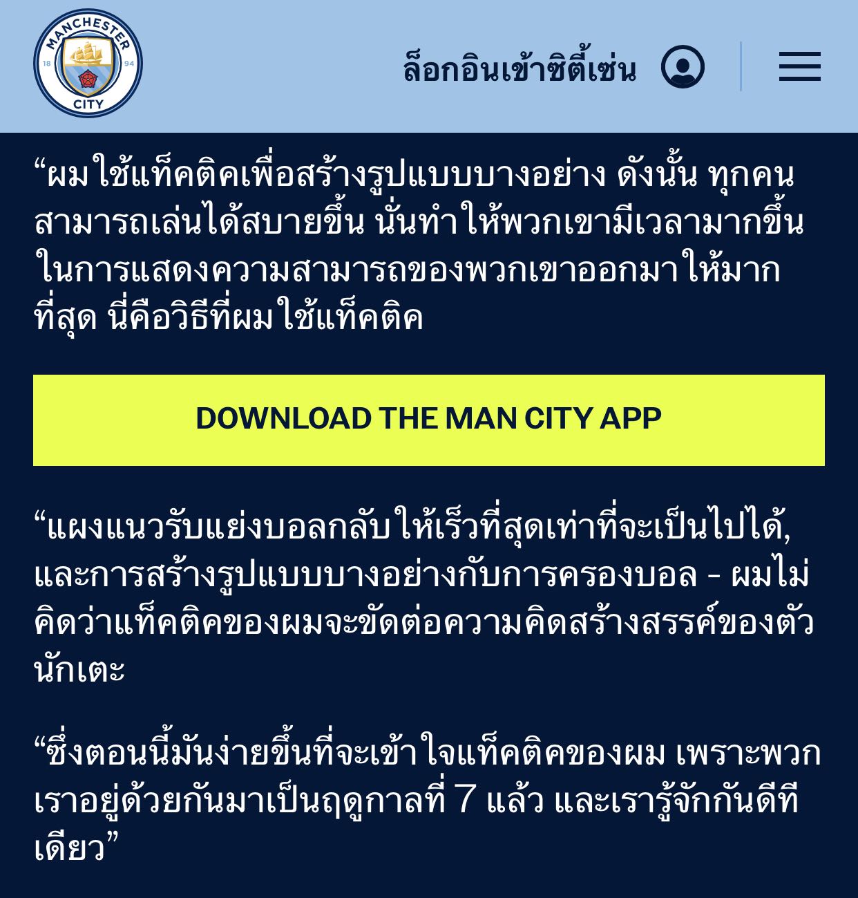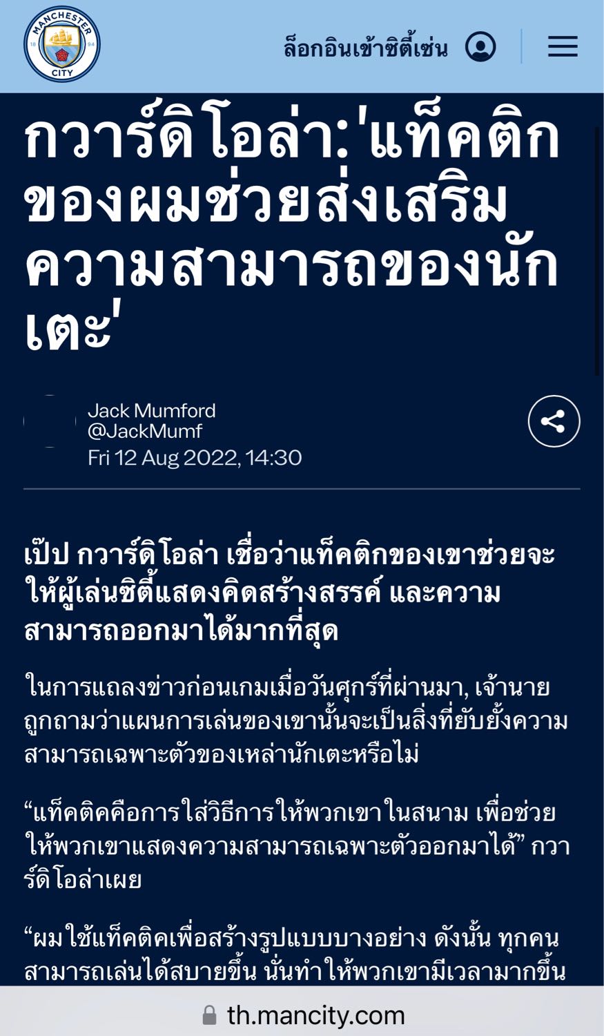 เป๊ป กวาร์ดิโอล่า กุนซือแมนเชสเตอร์ ซิตี้ เปิดใจหลังเอาชนะ ลิเวอร์พูล ในศึกพรีเมียร์ลีก อังกฤษ นัดล่าสุดเป๊ป กวาร์ดิโอล่า ผู้จัดการทีม "เรือใบสีฟ้า" แมนเชสเตอร์ ซิตี้ เผย บอกลูกทีมให้ลืมผลกา