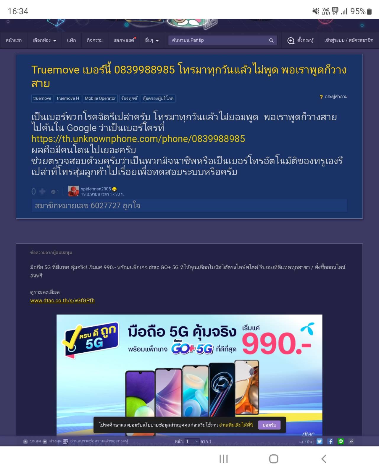 เมื่อ 15:24 น. มีเบอร์ 0953765591 โทรมาบอกว่า เราได้รับสิทธิ์ เป็นโปรเน็ต unlimited แบบรายเดือน (ของเดิมใช้แบบเติมเงิน) ซึ่งเราตกลงขอใช้เป็นเน็ต 6mbps + โทรฟรีใ