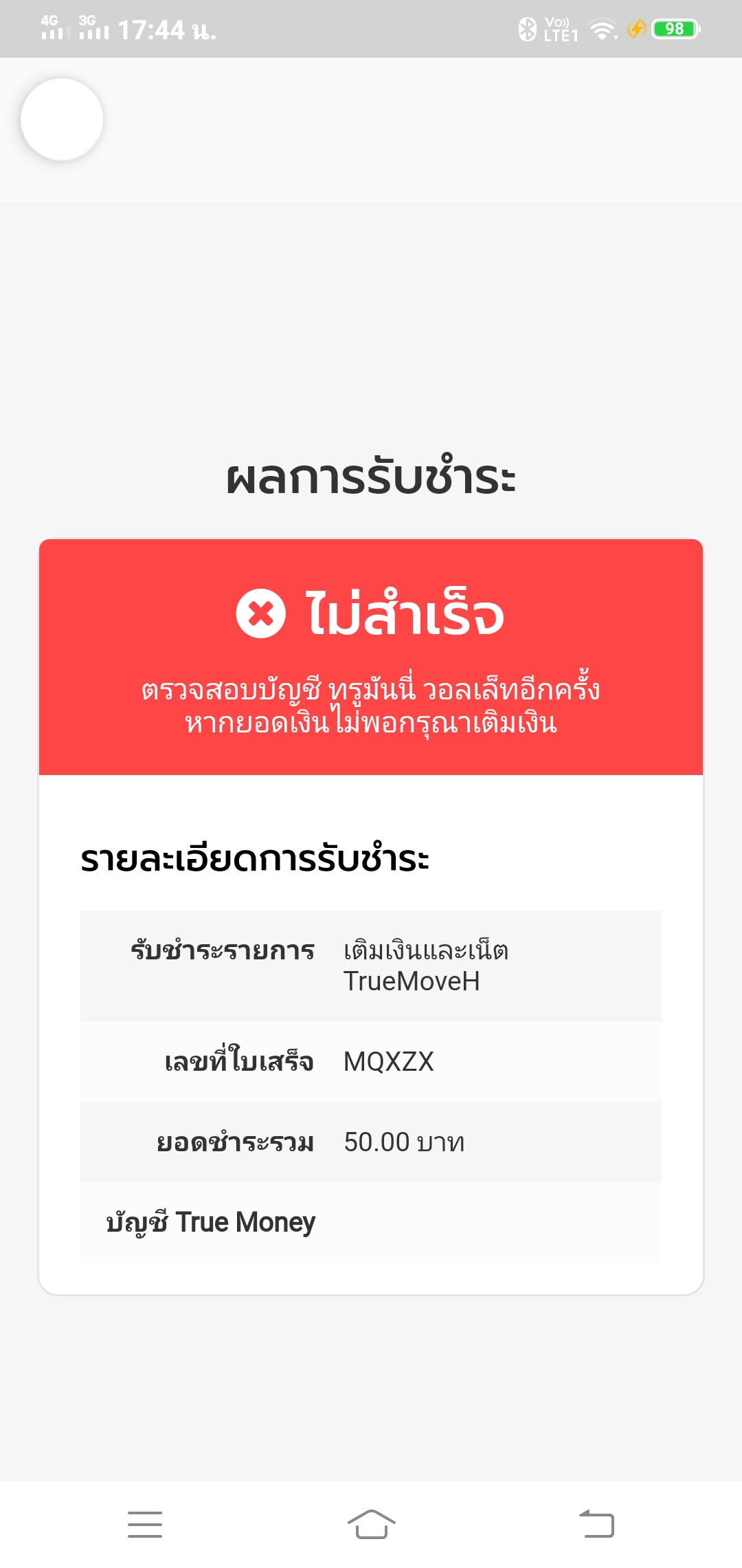 โปรของทรูมูฟ เติมเงิน 50 บ ได้ 100 บ. จากบิล เซเว่นฯ เติมยังไง ก็ไม่ผ่าน บอกให้ตรวจสอบเงิน ทั้งที่มี