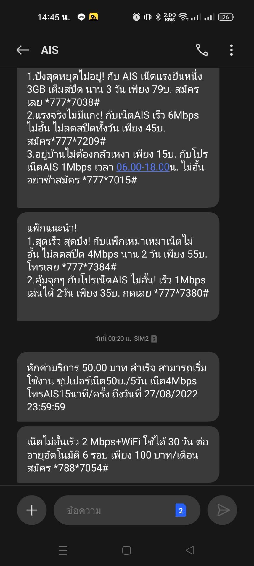 สมาร์ท-กฤตยชญ์ ขอขอบคุณที่สนใจข้อมูลของ AIS นะครับ ไม่ต้องเป็นกังวลใจ ยินดีตรวจสอบให้ครับ สามารถแจ้งเบอร์ที่ใช้งานและแพ็กเกจเสริมที่กดสมัครเข้ามาทางหลังไมค์ได้เลยครับ