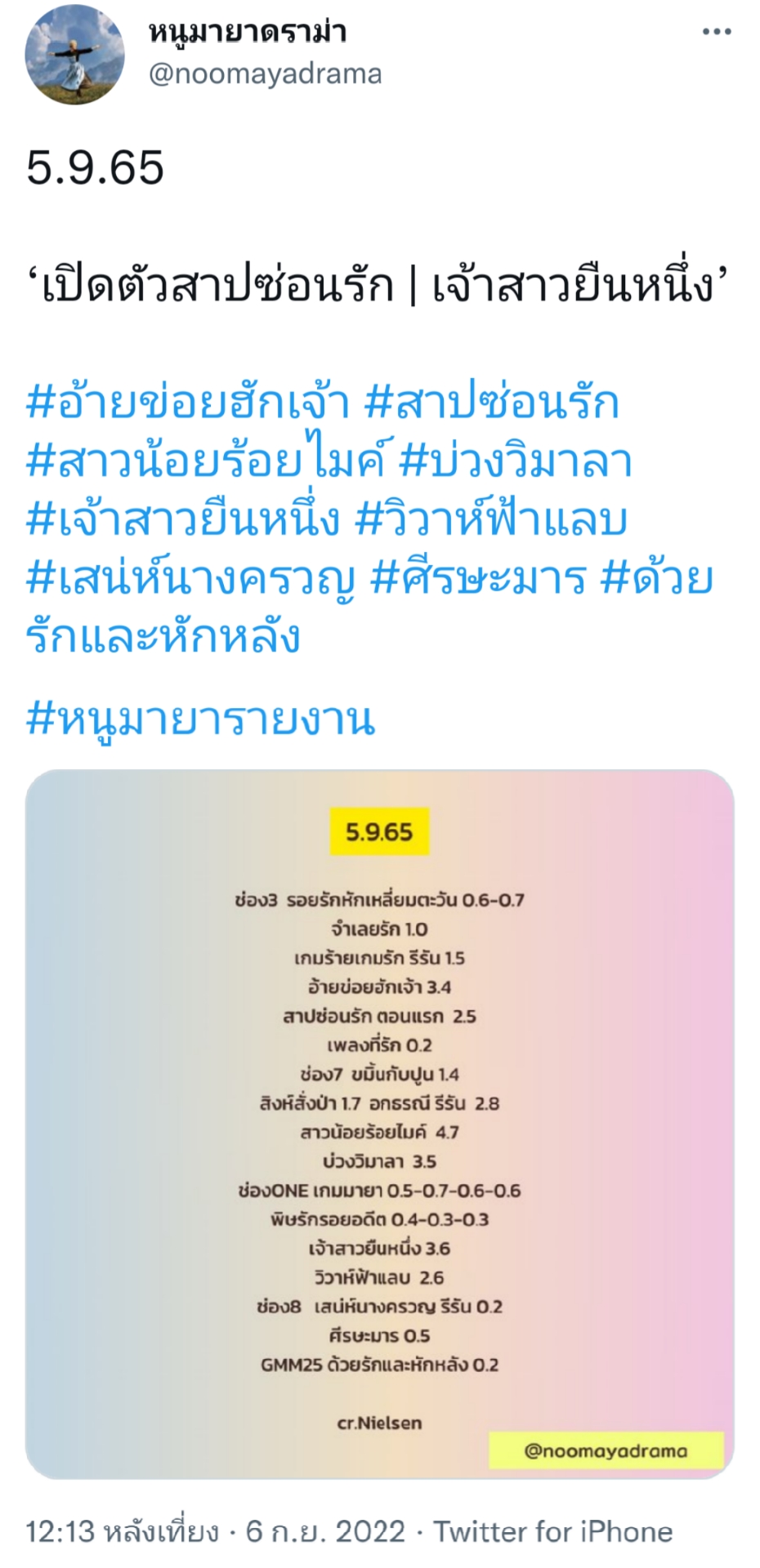 เรตติ้ง 15+NW : 8.337 15+BKK : 5.424 15+URBAN : 7.668 15+RURAL : 9.291 ขอขอบคุณข้อมูลจาก : คุณโอ๊ต บุตรรัตน์ ผู้เขียนบทละคร