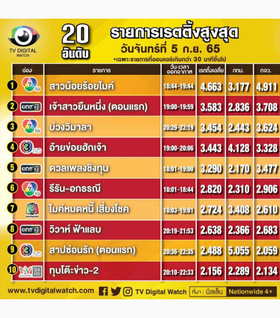 🔎 TOP20 รายการช่องทีวีดิจิทัล (5 ก.ย.65)