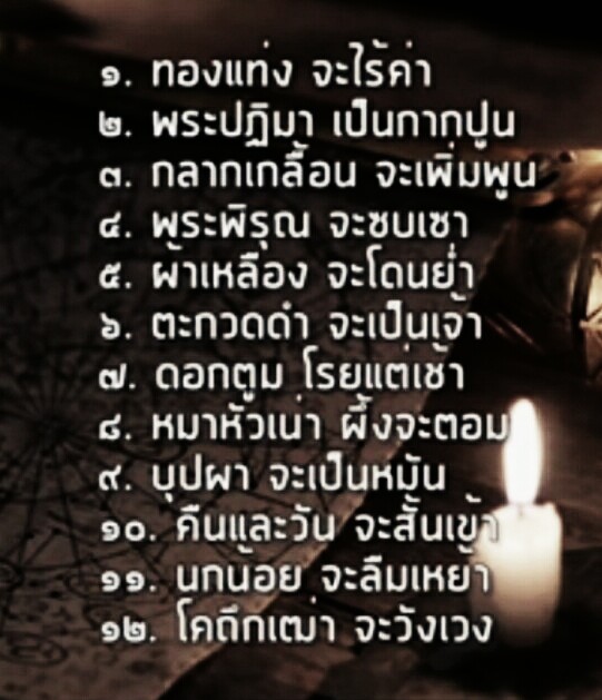 ผู้คนจะไม่กลัวบาปกลัวกรรม เมามันกับการติเตียนดูหมิ่นดูแคลนพระสงฆ์ กับทั้งพระสงฆ์ สามเณร ก็ไม่ตั้งอยู่ในศีลในธรรม ไม่เคารพรักธรรมนิยม ใช้ผ้าเหลืองแสวงหาลาภ จะหาผู้มีศีลมีธรรมก็เหลือน้อย