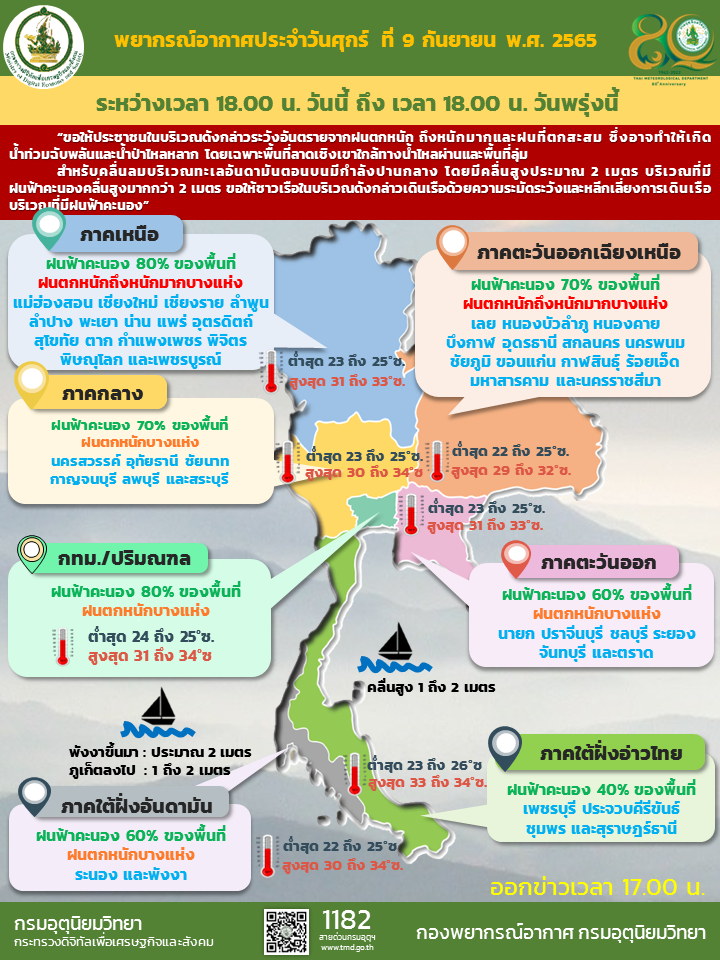 9 ก.ย.2565 - เมื่อเวลา 17.00 น. กรมอุตุนิยมวิทยา ออกประกาศเรื่อง "ฝนตกหนักถึงหนักมากบริเวณประเทศไทย และคลื่นลมแรงบริเวณทะเลอันดามันตอนบนและอ่าวไทยตอนบน (มีผลกระทบจนถึงวันที่ 9 กันยายน 2565)" ฉบับที่ 13 ระบุว่า ร่องมรสุมกำลังแรงพาดผ่านภาคเหนือตอนล่าง ภาคกลางตอนบน เข้าสู่หย่อมความกดอากาศต่ำบริเวณภาคตะวันออกเฉียงเหนือ ประกอบกับมรสุมตะวันตกเฉียงใต้กำลังปานกลางพัดปกคลุมทะเลอันดามัน ภาคใต้ และอ่าวไทย