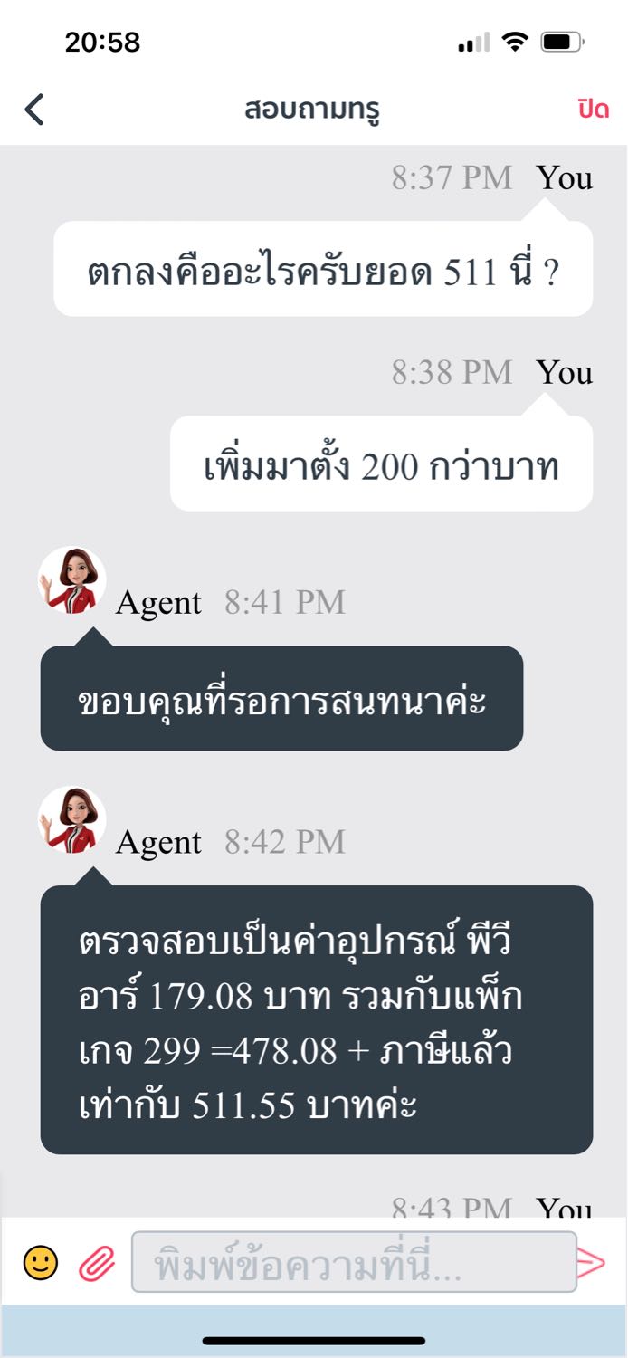 พอมาวันนี้เข้าแอปจะไปจ่ายค่าบริการ มียอดเพิ่มขึ้นมาเป็น 511 บาท ผมเลยถามเจ้าหน้าที่ว่าทำไมยอดมันเพิ่มเพราะแพ็คเกจจริงๆที่ผมต้องจ่ายมันมีแค่แพ็คเกจหลัก 299 บาท บวก vat 7% ก็สามร้อยนิดๆ เจ้าหน้าที่บอกมาว่างี้ครับ