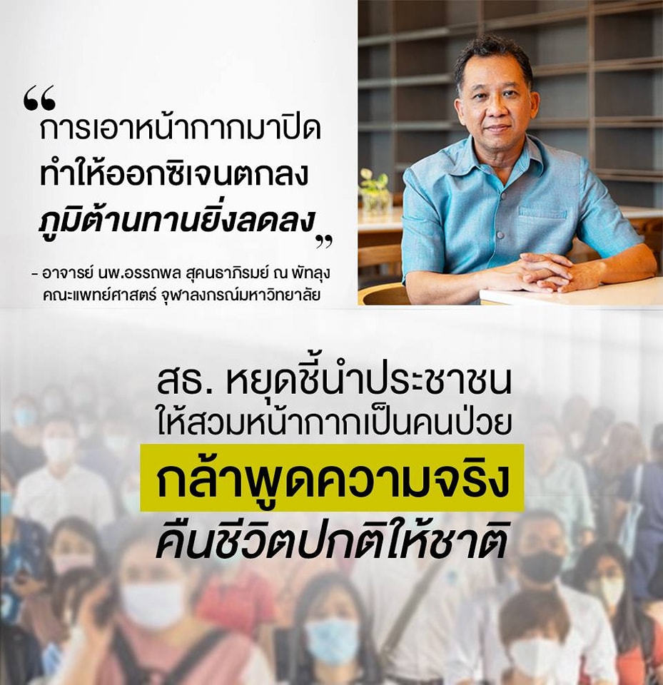 “การดูแลสุขภาพด้วยตนเองมีหลักสำคัญ คือ การได้รับออกซิเจนเต็มปอดซึ่งจะดีต่อสุขภาพ แต่ที่เป็นอยู่คือ การเอาหน้ากากมาปิด ทำให้ออกซิเจนตกลง