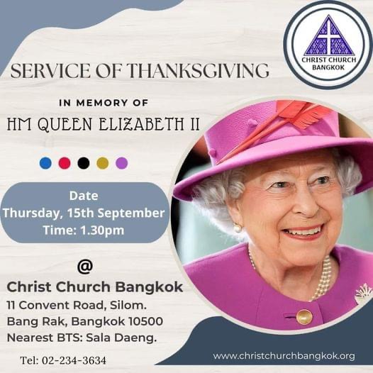 ขอเชิญพี่น้องเข้าร่วมพิธีนมัสการขอบคุณพระเจ้าในการร่วมรำลึกถึงสมเด็จพระราชินีนาถเอลิซาเบธที่ 2 ในวันพฤหัสบดีที่ 15 กันยายน 2022 เวลา 13.30 น. ที่คริสตจักรไคร้สตเชิช กรุงเทพ