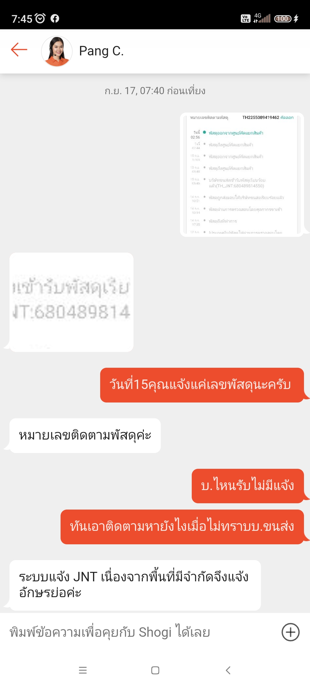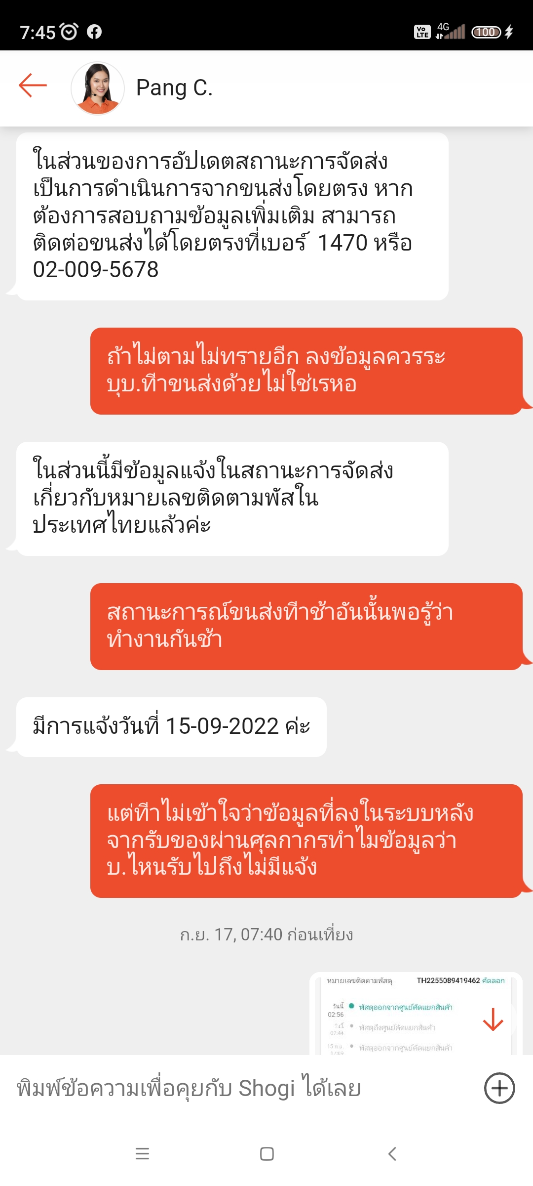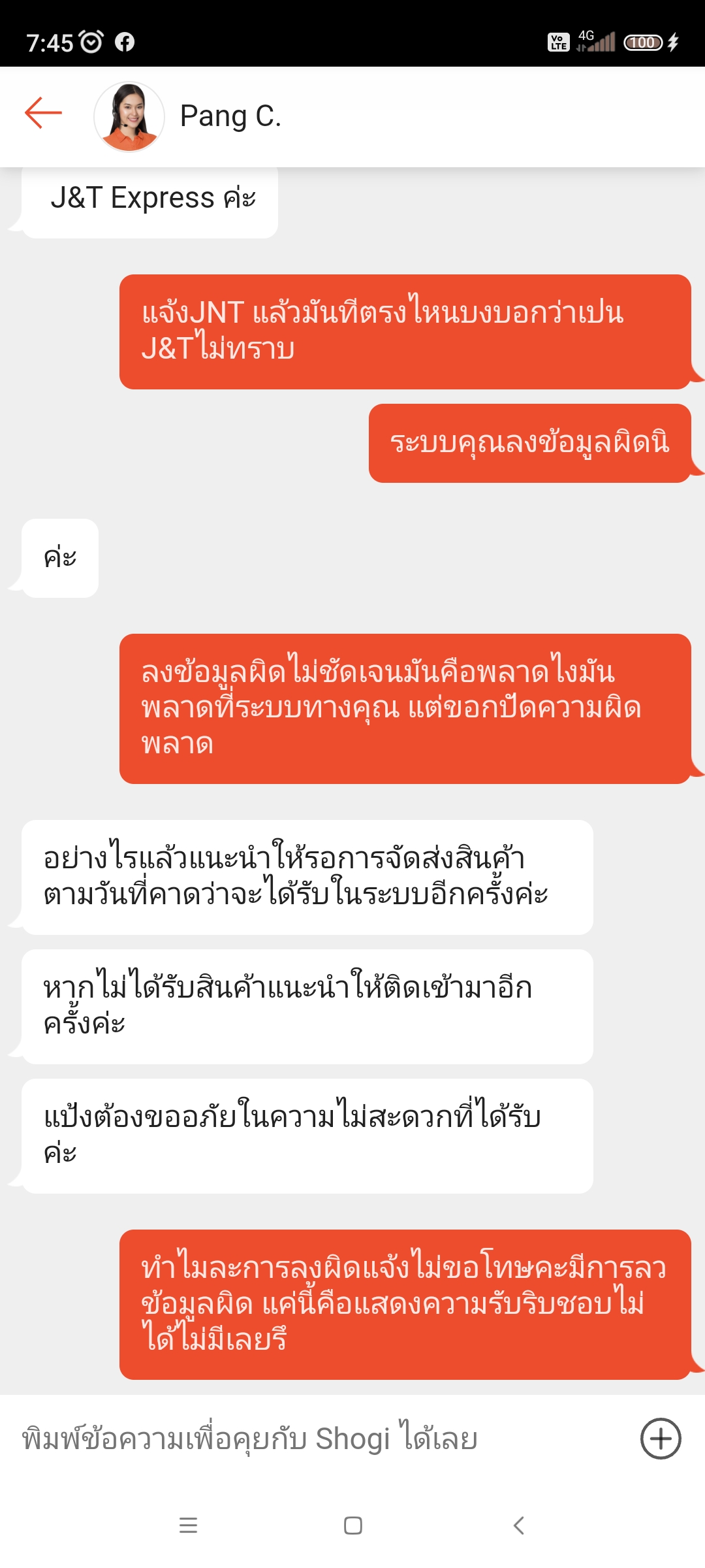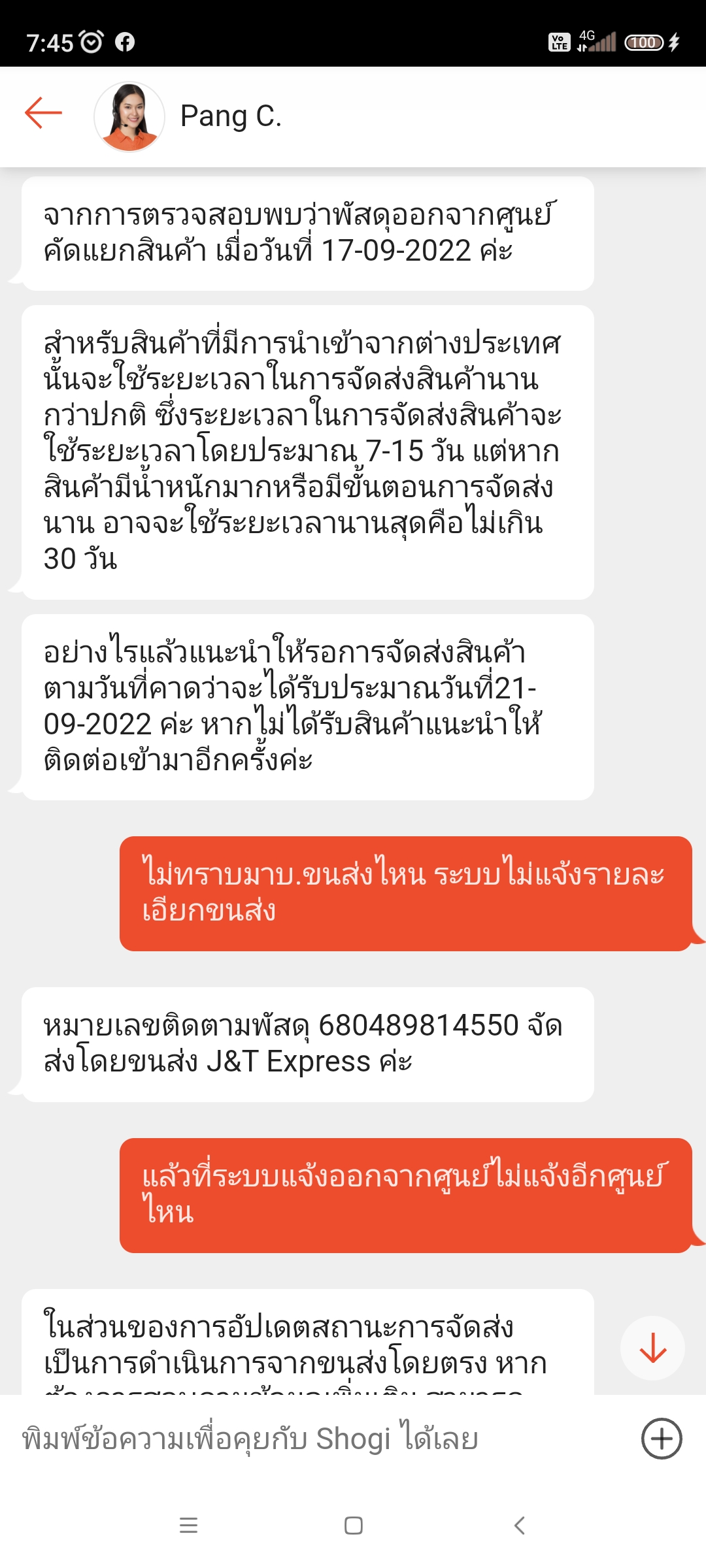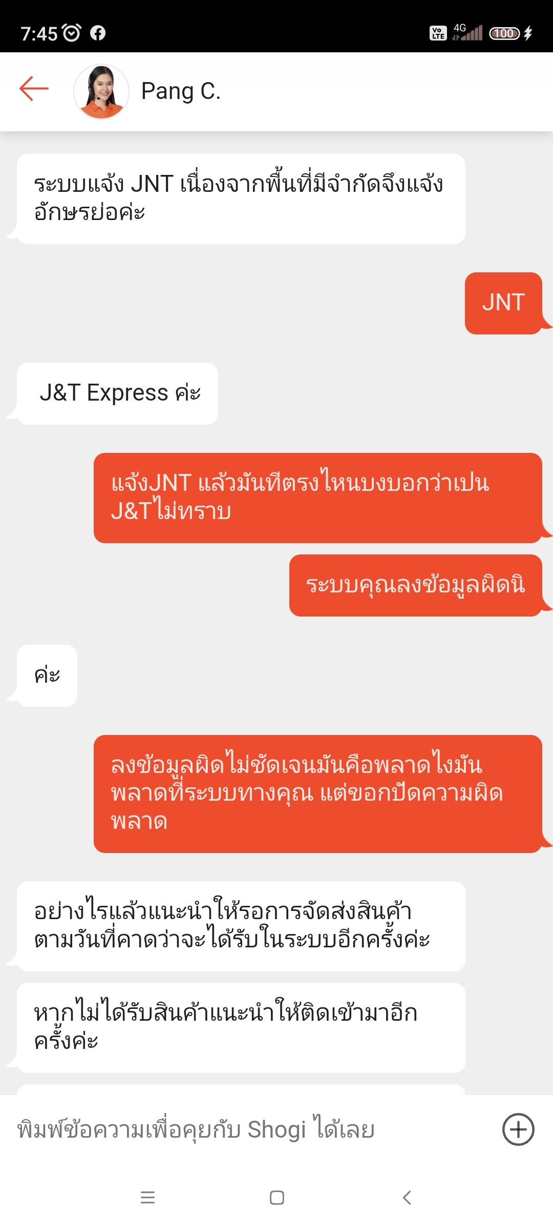 สั่งของจากจีนมาช้าเข้าใจแต่การลงข้อมูลไม่ระบุบ.ยขนส่งที่เข้ารับสินค้าจากศุลกากรเนี้ยจะตามของเองถูกมัยที่ลองหาไม่มีขึ้นในระบบ จนติดต่อถามพนง.แชทบอกมา บ.ขนส่งJ&T แต่ในระบบแจ้งอักษรย่อ JNTและรหัสพัสดุ แจ้งแบบนี้มีตรงไหนระบุว่าบ.ไนหรับสินค้าไปละ พอถามกลับบ.ก็แจ้งไปอักษรย่อ JNTกับ J&T มันคนละอันเลย ยังจะตอบปัดความผิดพลาดที่ไม่ลงรายละเอียดการที่ทราบว่าบ.ไหนขนส่งเราจะคาดการณ์ได้กะยะระเวลาได้หากของมาถึงปลายทางหรือจะมีการล่าช้าเลื่อนบ้างไหมแต่ละบ.มีการคาดเคลื่อนได้บางบ.ของมาถึงไม่มีพนง.หรือจำนวนรอบส่งไม่พอจะรอวันถัดไป ต้องตามเช็กระบบด้วยตัวเอง