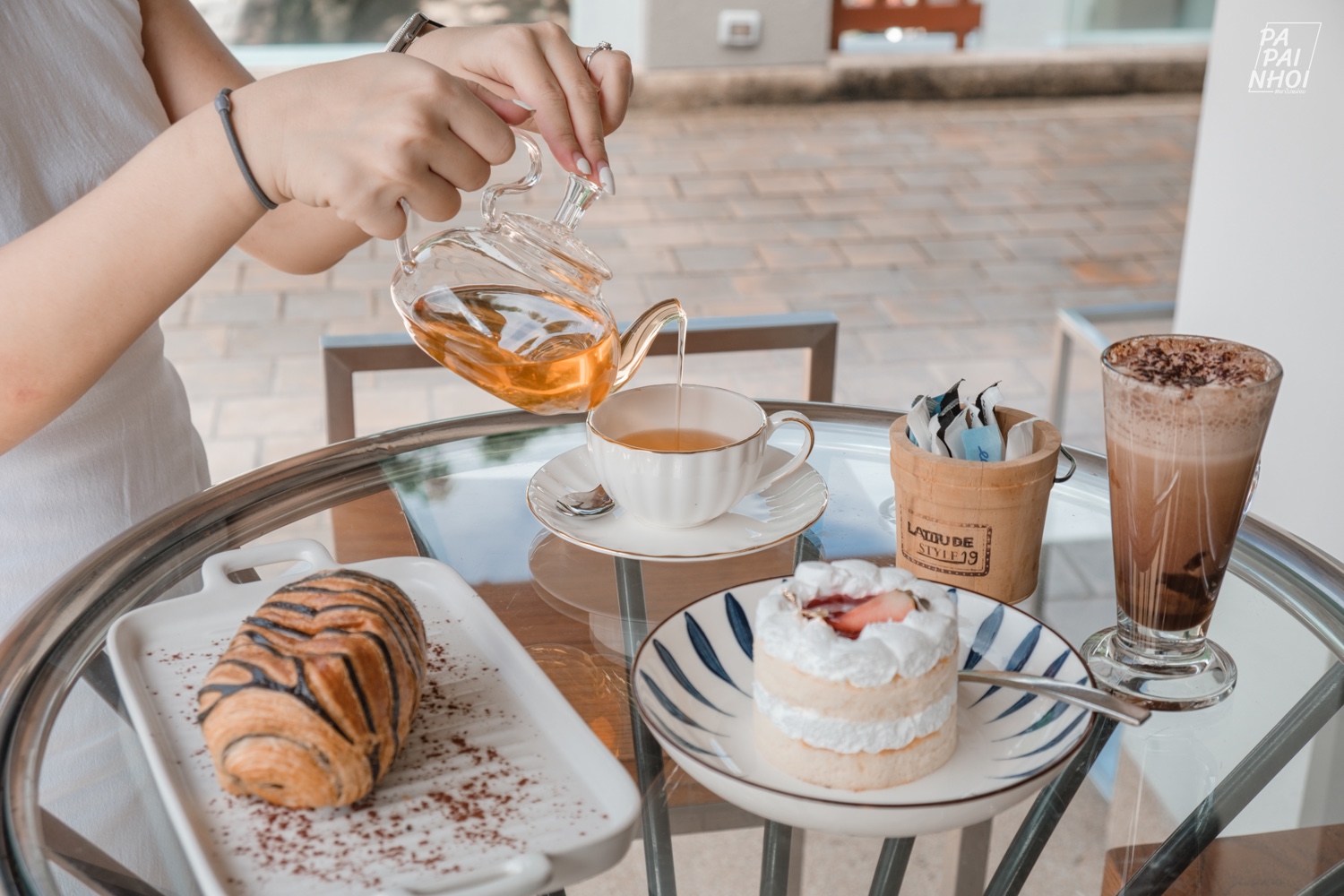 ที่นี่มีทั้งชาและเครื่องดื่มร้อนให้สั่งคู่กับเบเกอรี่ มีที่นั่ง ทั้งด้านใน ด้านนอก