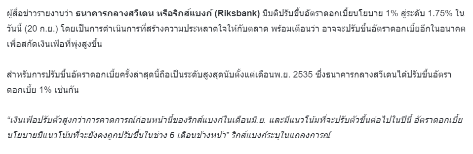 “แบงก์ชาติสวีเดน” ขึ้นดอกเบี้ยแรง 1% รอบ 30 ปี