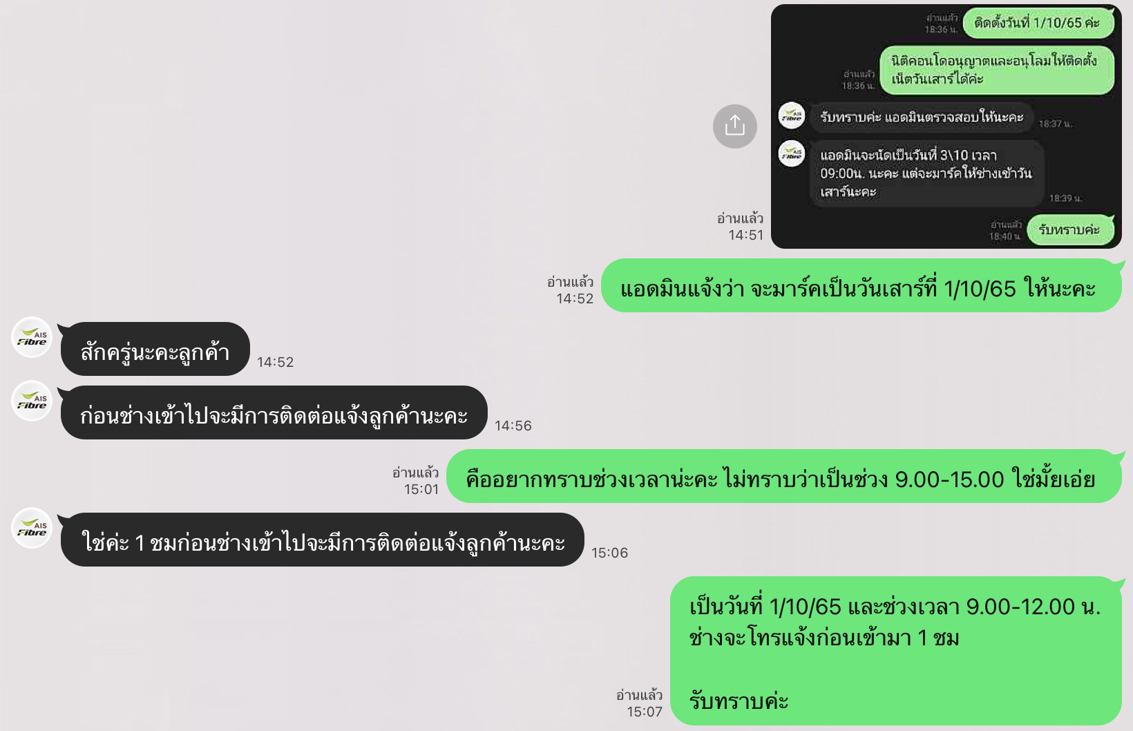 จากนั้นจึงแอดไลน์AIS เข้าไปสอบถามข้อมูล นัดวันติดตั้ง 1-10-2022 โดยแจ้งแอดมินว่า นิติอนุญาตให้ติดตั้งได้ในวันเสาร์ได้*