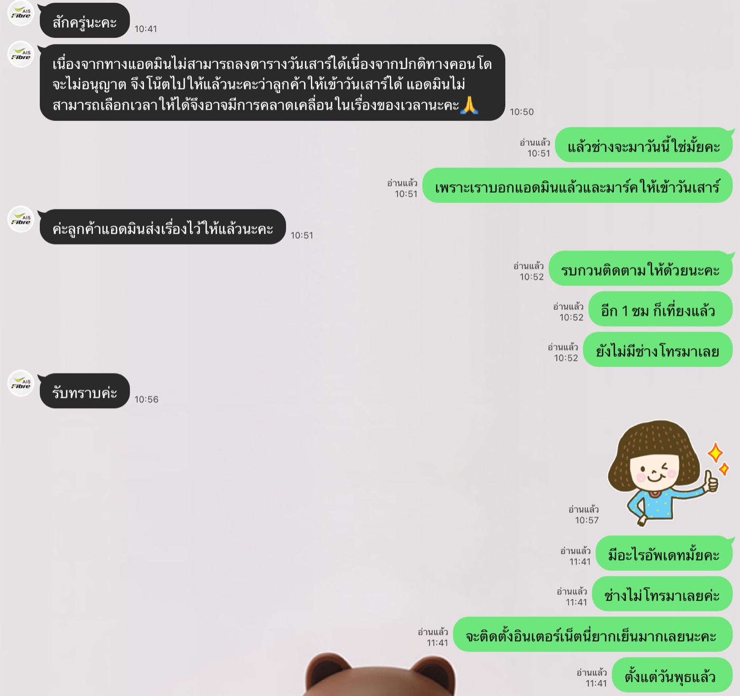 -เหตุการณ์แบบนี้เราจะร้องเรียนอะไรได้บ้าง เราเสียเวลามากมีธุระต้องจัดการ แล้วต้องมารอคนๆเดียว วันนี้ถ้าเราไม่ได้ติดตั้ง คงย้ายค่ายทั้งมือถือ และเลือกอินเทอร์เน็ตค่ายอื่นแทน เสียเวลามาก นัดไม่เป็นนัดตั้งแต่วันพุธยันวันเสาร์