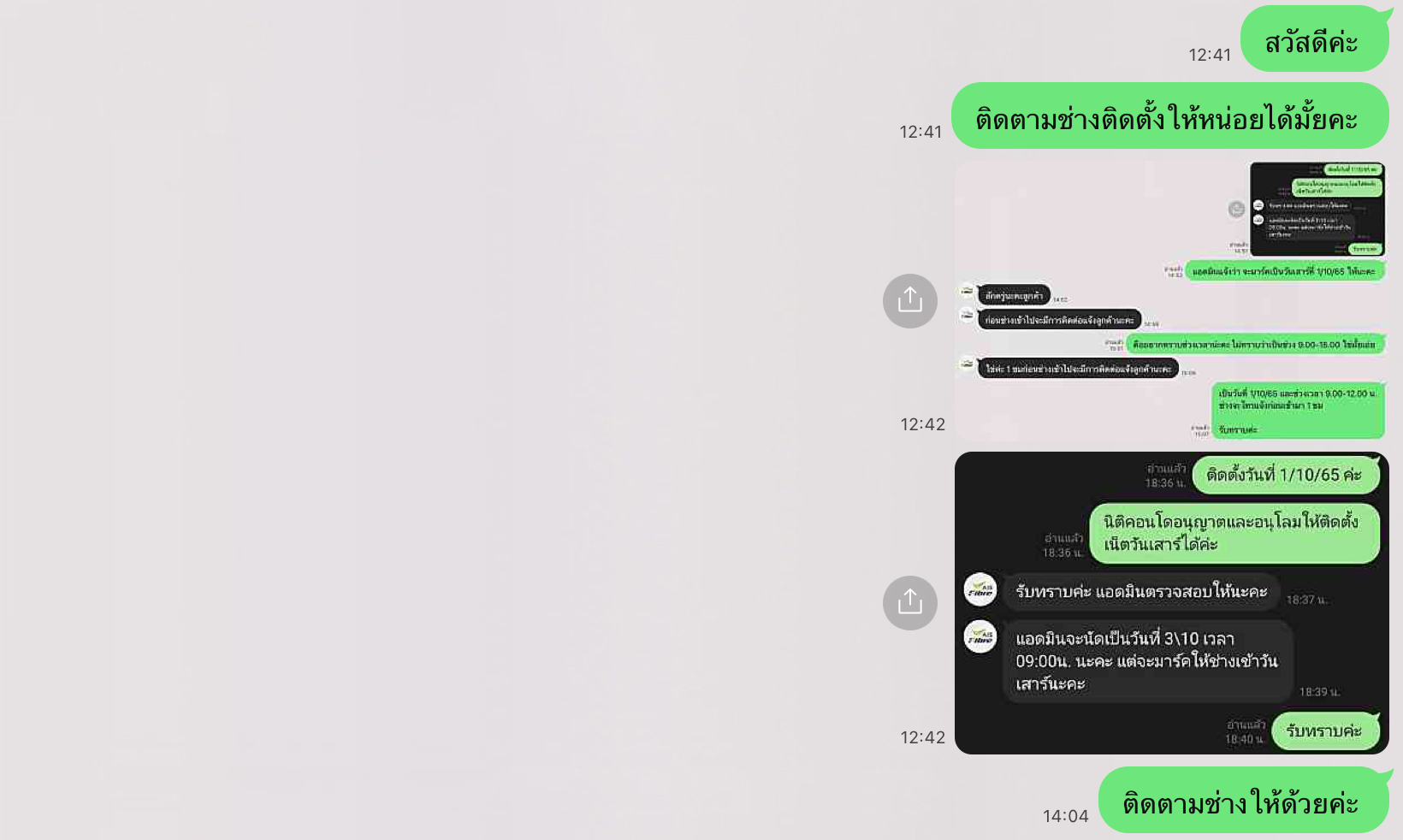พอดีเกิดเหตุครั้งแรกวันอังคารที่ 27-9-2022 เราแจ้งแอดมินไปว่าพอจะมีคิวว่างวันพรุ่งนี้มั้ย พอดีว่าง แอดมินแจ้งว่า พรุ่งนี้ช่างว่าง 16.00 น เราเลยรับและยืนยันให้มา ตกค่ำมาวันอังคารช่างติดตั้งโทรมาบอกว่าขอบ่ายสองได้มั้ย แล้วเราเลยถามช่างกลับว่า ได้ค่ะ มาเร็วก็ดี วางสายไปไม่ถึง 5 นาที ช่างติดต่อกลับมาว่า ทีมช่างอีกคนลากลับบ้าน ขอเป็น 16.00 เหมือนเดิมนะครับ เราเลยโอเค ตกลง