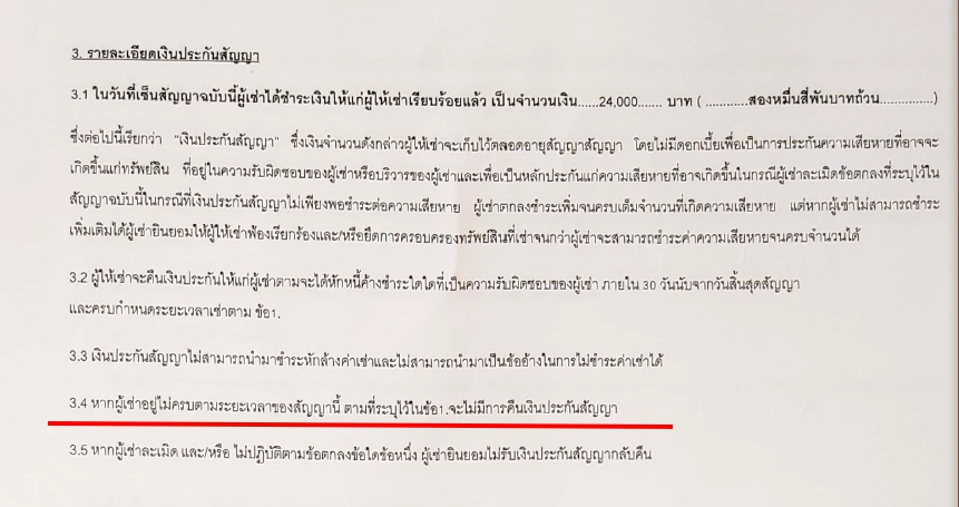ตอนเซ็นสัญญาอ่านไม่ละเอียดเพิ่งเห็นว่ามีระบุว่าผู้ให้เช่าขอสงวนสิทธิ์ที่จะเรียกร้องค่าเช่าที่ต้องชำระจนครบถ้วนตามอายุสัญญา โดยผู้เช่าไม่มีสิทธิโต้แย้งทักท้วงหรือเรียกร้องคืนไม่ว่ากรณีใดๆ สัญญาเช่า 3