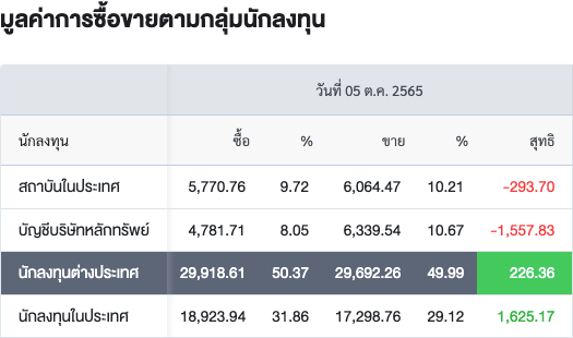Sinthorn Summary 26/10/2565 : ต่างชาติซื้อสุทธิ 847.72 ลบ.