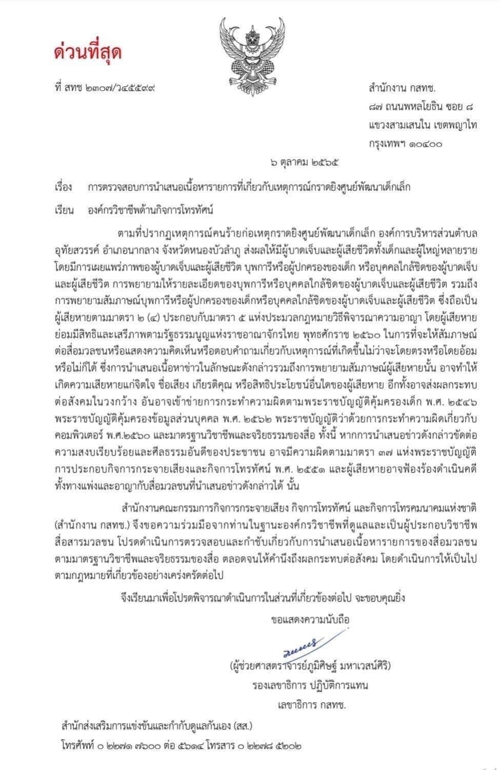 สำนักงานคณะกรรมการกิจการกระจายเสียง กิจการโทรทัศน์ และกิจการโทรคมนาคมแห่งชาติ (สำนักงาน กสทช.) ได้ทำหนังสือด่วนที่สุดที่ สทช 2707/ว45599 เรื่อง การตรวจสอบการนำเสนอเนื้อหารายการที่เกี่ยวกับเหตุการณ์กราดยิงศูนย์พัฒนาเด็กเล็ก ถึงองค์กรวิชาชีพด้านกิจการโทรทัศน์ โดยใจความระบุว่า